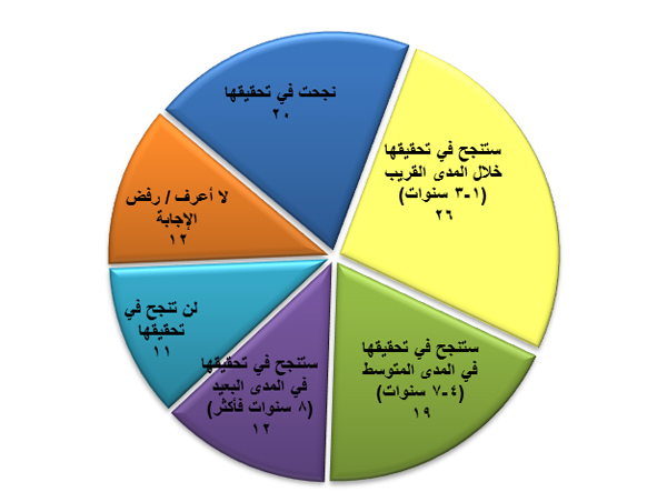 إنّ أكثريّة الرأي العامّ تعتقد أنّ الثورات، نجحت أو سوف تنجح في المدى القريب والمتوسّط في تحقيق ضمان الحرّيات العامّة وحقوق الإنسان، وضمان حريات التعبير والتجمّع والتنظيم، وإرساء قواعد الديمقراطية والتنمية الاقتصادية، ومحاربة الفساد، وتحقيق العدالة الاجتماعيّة. مقابل 12 % يعتقدون أنّها لن تنجح في تحقيق هذه الأهداف على الإطلاق.