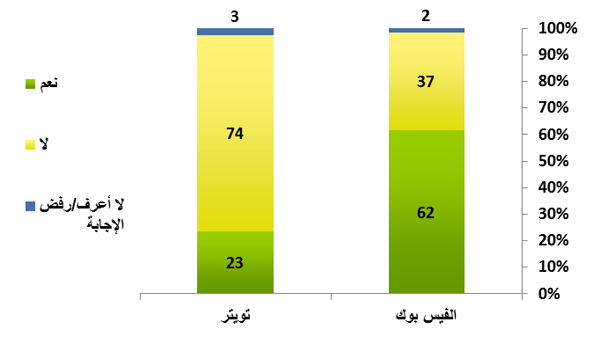 المستجيبون الّذين أفادوا بأنّ لديهم حسابًا على "الفيس بوك"، و"تويتر" من مُجمل مستخدمي الإنترنت