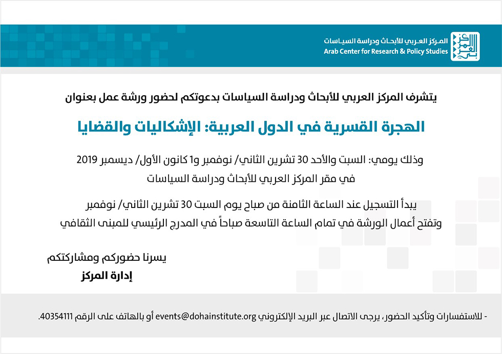 تنطلق، السبت 30 تشرين الثاني/ نوفمبر، أعمال الورشة العلمية "الهجرة القسرية في البلدان العربية: الإشكاليات والقضايا"، التي يعقدها المركز العربي للأبحاث ودراسة السياسات، على مدى يومين، في مقره بالدوحة.