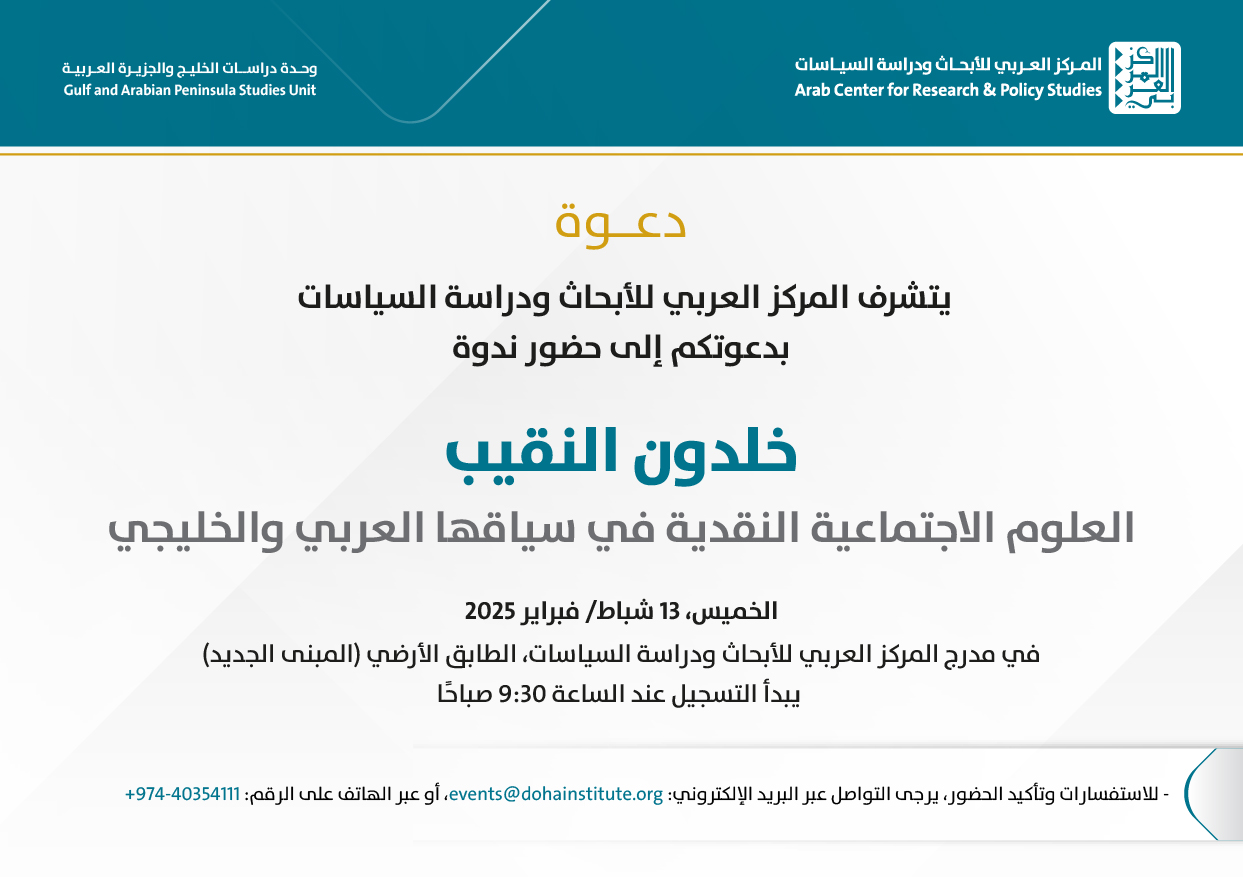 تعقد وحدة دراسات الخليج والجزيرة العربية في المركز العربي للأبحاث ودراسة السياسات ندوة بعنوان "خلدون النقيب: العلوم الاجتماعية النقدية في سياقها العربي والخليجي" يوم الخميس، 13 شباط/ فبراير 2025، تناقش الإنجازات الفكرية والأكاديمية للسوسيولوجي الكويتي الراحل خلدون النقيب، لما قدّمه من مقاربات نقدية لحزمة من الظواهر المجتمعية الكبرى، لا سيما منطقة الخليج، المرتبطة على نحو جوهري بالمجال السياسي، كالقَبَلية السياسية، والدولة التسلطية، وما إلى ذلك.