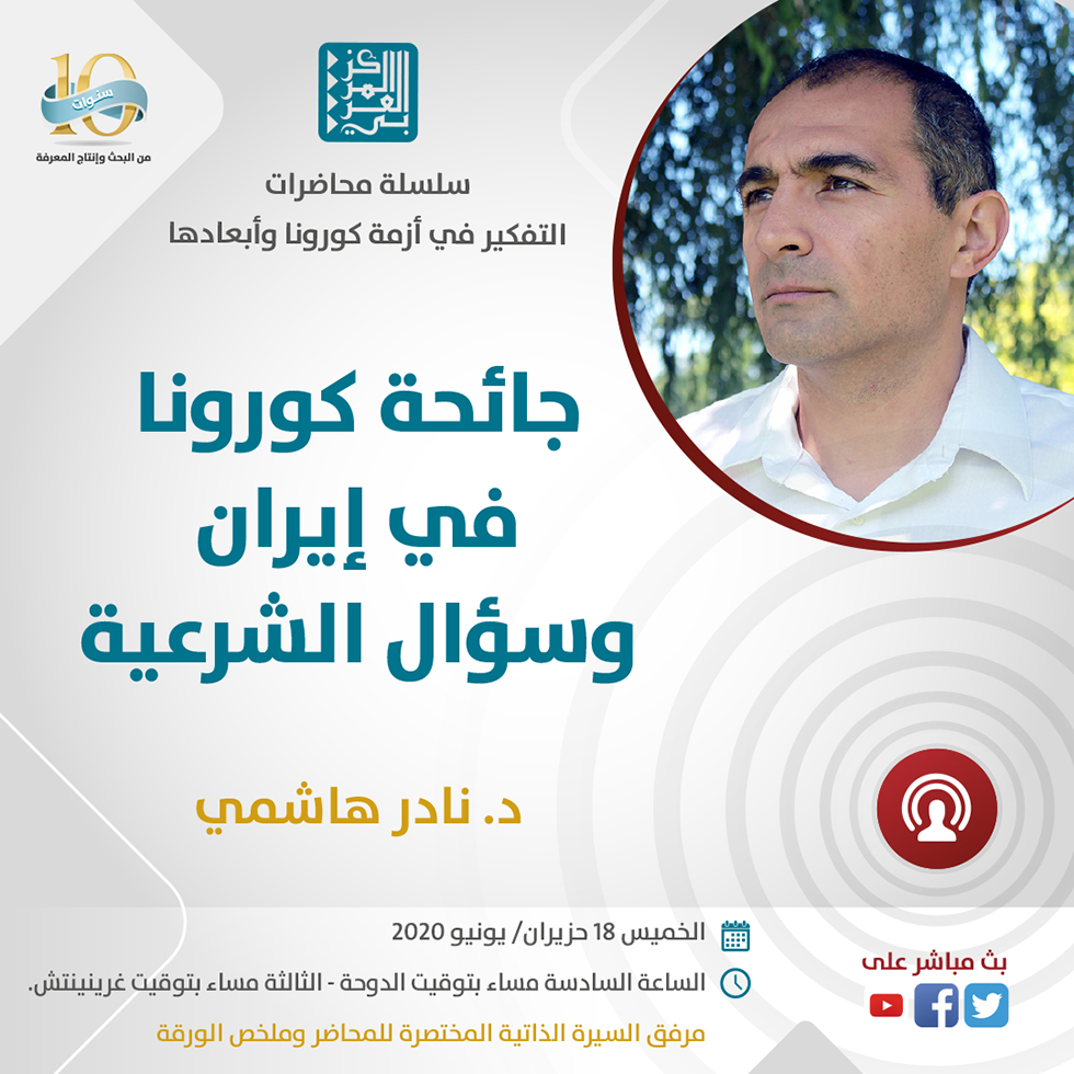 تستضيف وحدة الدراسات الإيرانية في المركز العربي الباحث يوم الخميس 18 حزيران/ يونيو 2020، في السادسة مساء بتوقيت الدوحة، الدكتور نادر هاشمي لتقديم محاضرة بعنوان: "جائحة كورونا في إيران وسؤال الشرعية" ضمن سلسلة محاضرات "التفكير في أزمة كورونا وأبعادها" التي بدأها المركز منذ شهر نيسان/ أبريل 2020.