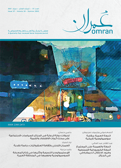 صدر عن المركز العربي للأبحاث ودراسة السياسات ومعهد الدوحة للدراسات العليا العدد السابع والثلاثون (صيف 2021) من دورية عمران للعلوم الاجتماعية. وتضمّن الدراسات التالية: "الدولة العربية: مقاربة سوسيولوجية تاريخية" لأدهم صولي ورايموند هينبوش، و"الدولة والهيمنة على المجتمع: الدولة الكوربوراتية التسلطية وقيود الانتقال الديمقراطي في الجزائر" ل عبد القادر عبد العالي، و"تحولات دولة الرعاية في الجزائر: السياسات الاجتماعية على مِحك أزمات الاقتصاد والتنمية" لحامي حسان، و"العمران التحتي وثقافة العشوائيات: دراسة نقدية" لنزار الصياد، و"الإبستيمولوجيا النسوية وتأثيرها في إنتاج المعرفة السوسيولوجية وفهمها في المنطقة العربية" لرشيد بن بيه.