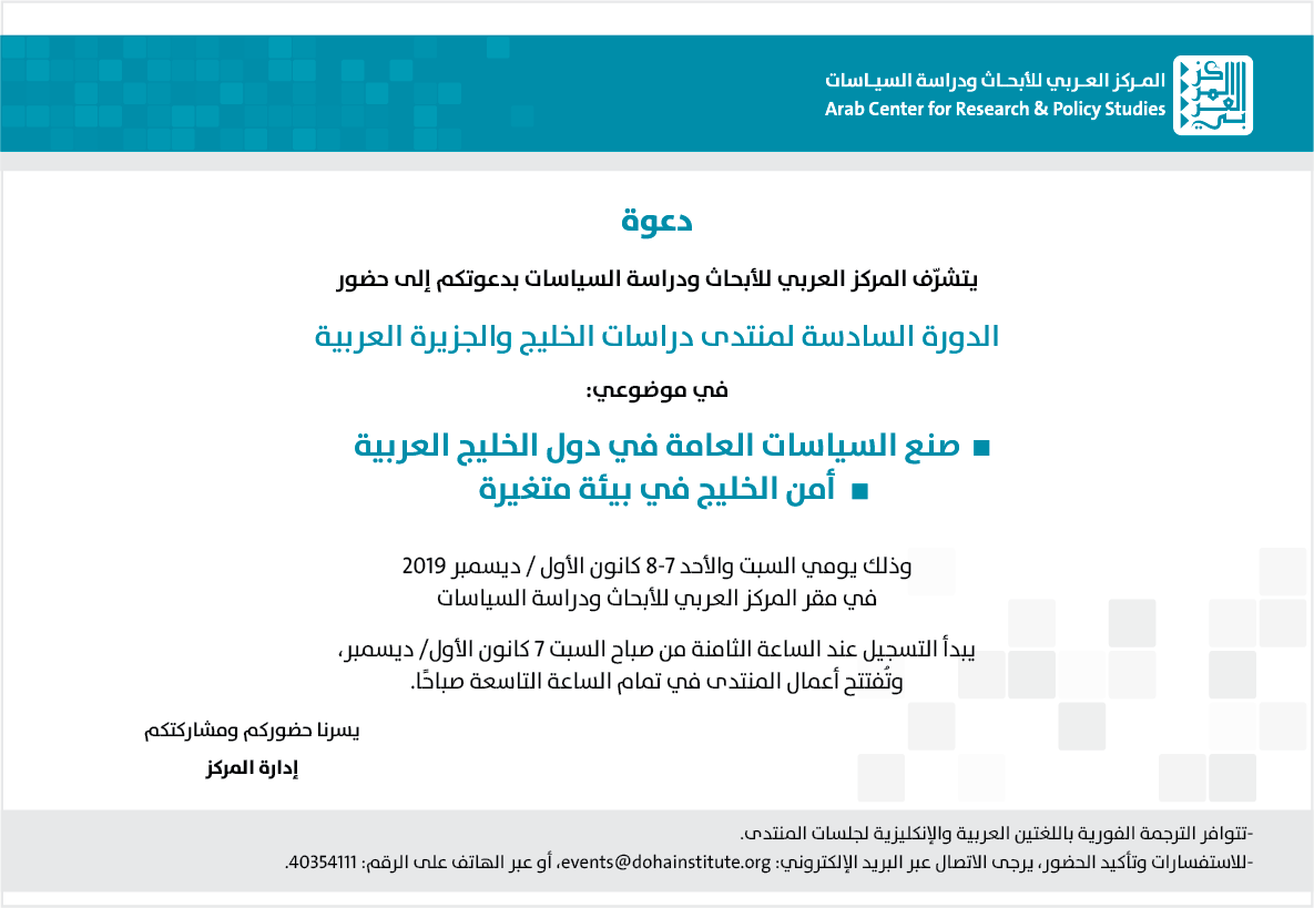 يعقد المركز العربي للأبحاث ودراسة السياسات، يومي 7 و8 كانون الأول/ ديسمبر 2019، الدورة السادسة لمنتدى دراسات الخليج والجزيرة العربية، في مقره الرئيس بالدوحة.