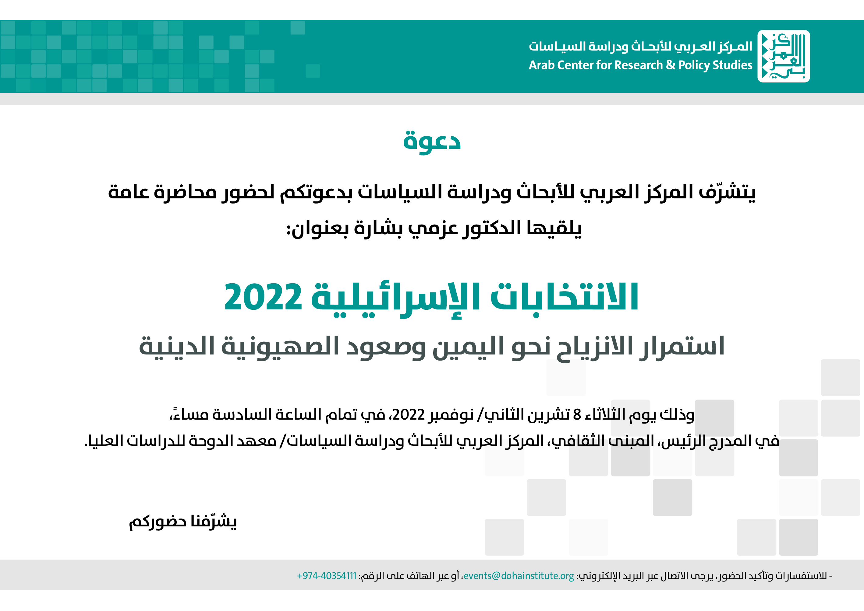 يتشرّف المركز العربي للأبحاث ودراسة السياسات بدعوتكم إلى حضور محاضرة عامّة يلقيها الدكتور عزمي بشارة بعنوان: "الانتخابات الإسرائيلية 2022: استمرار الانزياح نحو اليمين وصعود الصهيونية الدينية"، وذلك يوم الثلاثاء 8 تشرين الثاني/ نوفمبر 2022، الساعة السادسة مساءً، في مقر المركز العربي، المبنى الثقافي/ المدرج الرئيس. تُبثّ المحاضرة على منصات التواصل الاجتماعي للمركز. يسرّنا حضوركم.