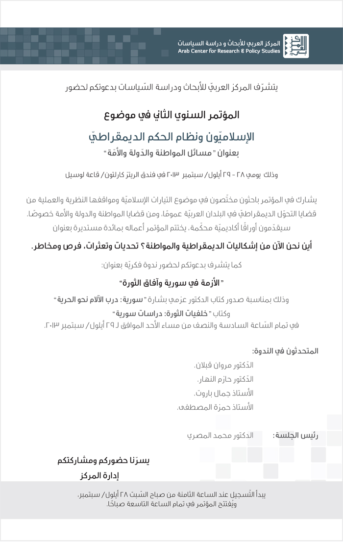 دعوة لحضور المؤتمر الثاني "الإسلاميون ونظام الحكم الديمقراطي" وندوة "الأزمة السورية وآفاق الثورة"