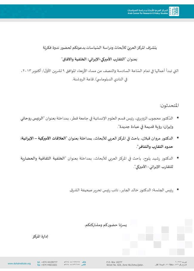 دعوة عامّة لحضور ندوة فكريّة عن: "التقارب الأميركي الإيراني"