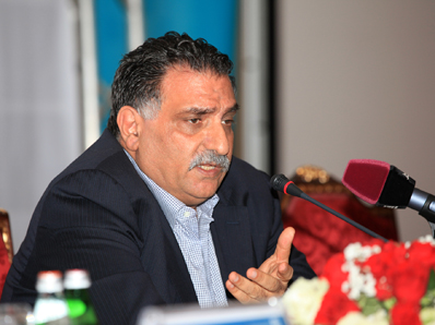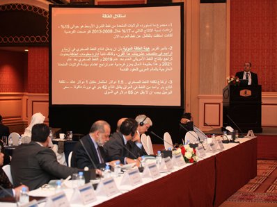 | الدكتور محمد المصري خلال عرضه نتائج المؤشر العربي 2014 |