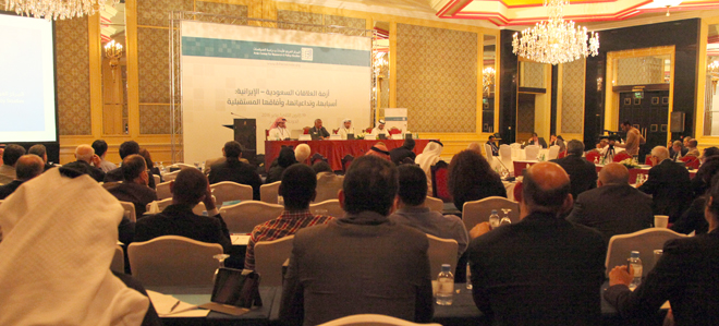 وقدّم الدكتور مروان قبلان رئيس وحدة تحليل السياسات في المركز العربي ورقة بعنوان "الأزمة السعودية-الإيرانية وبنية النظام الإقليمي"، أوضح فيها أن هذا الصراع يأتي في سياق مرحلة انتقالية بين انهيار نظام إقليمي سابق وعملية جارية لتشكيل نظام جديد، مع تفكك دولة إقليمية قوية هي العراق وكذا انسحاب قوى كبرى تقليدية في المنطقة ممثلة في الولايات المتحدة ودخول قوى أخرى وفي مقدمتها روسيا، فبرزت السعودية وإيران قوتين إقليميتين متنافرتين متصارعتين. وأشار إلى أن إيران استغلت تفكيك الغزو الأميركي للعراق لتوسع هيمنتها في البلاد وتبسط نفوذها بما أعطاها إمكانيات مناورة أكبر على الصعيد الإقليمي. ورأى المحاضر أن نقطة إعلان إيران مطامحها في الهيمنة على المنطقة كانت عند خروج القوات الأميركية من العراق، فقد كانت إيران قد شيدت شبكة لإحكام نفوذها في المنطقة بالربط بين مختلف مواقع نفوذها وتحالفاتها، غير أنها فوجئت بالثورة السورية التي تعد العامل الأساس الذي منع إيران من تشكيل هلال الهيمنة الذي خططت له.