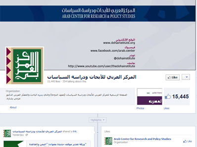 وقد أنشأ المركز العربي للأبحاث ودراسة السياسات صفحته الرسميّة على فيسبوك بتاريخ 27 شباط / فبراير 2011 أي بعد شهرٍ من مباشرته نشاطه بصفةٍ رسميّة بعد تأسيسه في كانون الأوّل / ديسمبر 2010. وتحصي الصفحة حاليًّا ما يقارب 15500 مشترك. ويتابع فريق صغير -نسبيًّا- بإشراف منسّقة الشّبكات الاجتماعيّة في المركز منى هدايه، تفعيل الصفحة بصفةٍ متواصلة 24 ساعة على 24 ساعة و7 أيّام في الأسبوع.