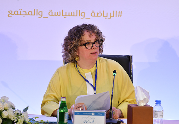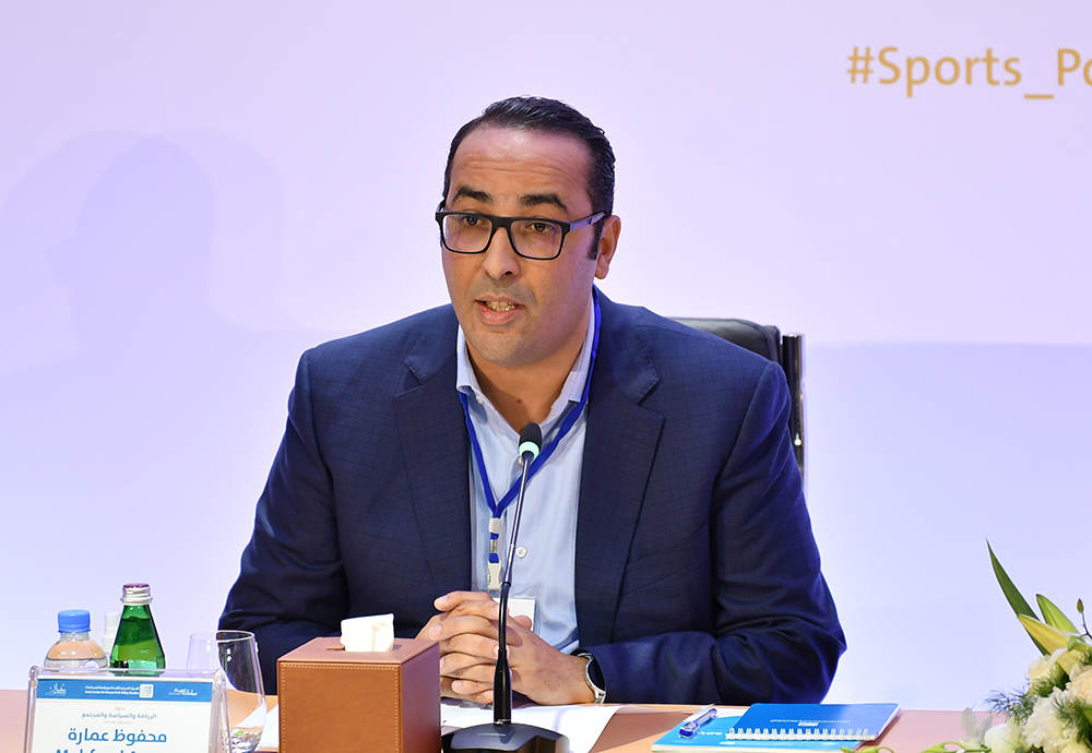 ترأست الجلسة الأولى من الندوة، أمل غزال، أستاذة التاريخ وعميدة كلية العلوم الاجتماعية والإنسانية بمعهد الدوحة للدراسات العليا، وشارك فيها باحثان. قدّم محفوظ عمارة، الأستاذ المشارك في السياسات والإدارة الرياضية في جامعة قطر، ورقةً بعنوان "الاتجاهات العالمية والمحلية لدراسات الرياضة في المنطقة العربية"، ناقش فيها الكيفية التي يُنظر بها إلى سياسات البحث في الرياضة، مع التركيز على النظرية البنائية، مشيرًا إلى أن البنائية توفر رؤى متعددة في دراسة الرياضة، بوصفها ظاهرة اجتماعية معقدة. وتطرّق الباحث إلى الكيفية التي هيمنت بها سرديات الحداثة على دراسات الرياضة، والتي تُعرّف عادةً بأنها من نتاج الغرب. وفي المقابل، نظر في تأثير الثقافات والحضارات الأخرى في البناء نحو الحداثة؛ بمعنى المعرفة والعلم والابتكار. واختتم الباحث مداخلته بمساءلة متعلقة بثراء نظرية المعرفة البنائية وتحدياتها عربيًّا، من خلال دراسات الرياضة، وما يشمل ذلك من مفهوم التعددية والتغير في الدراسات الرياضية، وتطبيق التحليل الخطابي لدراسة الرياضة في مختلف التقاليد الثقافية واللغوية، والنقد فيما يتعلق بنسبيّتها المحتملة.