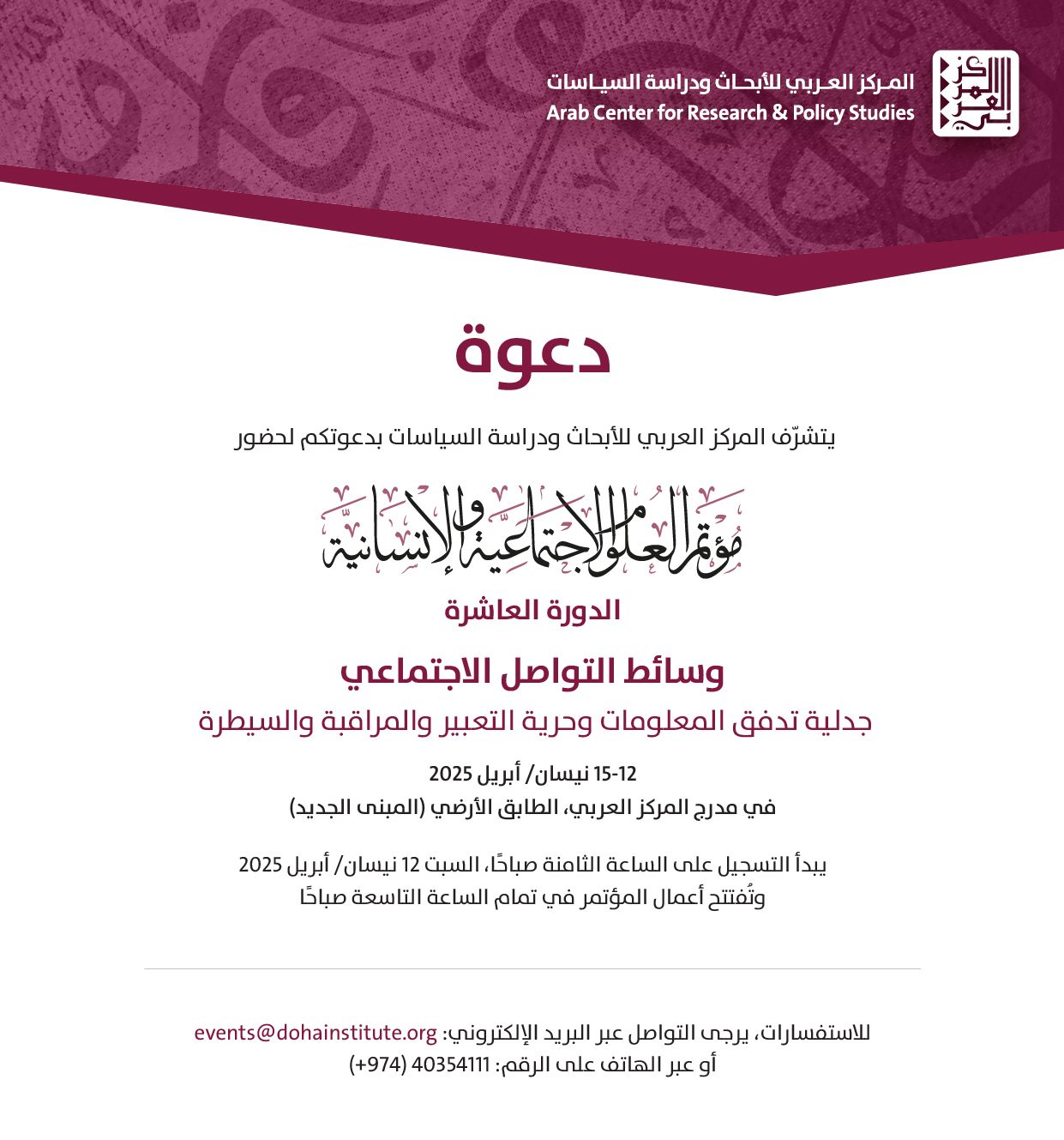 تنطلق يوم السبت 12 نيسان/ أبريل 2025 أعمال الدورة العاشرة لـ مؤتمر العلوم الاجتماعية والإنسانية. وقد اختار المركز العربي للأبحاث ودراسة السياسات "وسائط التواصل الاجتماعي: جدلية تدفق المعلومات وحرية التعبير والمراقبة والسيطرة" موضوعًا لهذه الدورة. ويأتي اختيار هذا الموضوع في سياق الاهتمام الذي يوليه المركز لدراسات وسائط التواصل الاجتماعي والفضاء الرقمي، إذ إنه أنشأ في خريف عام 2022 وحدةً بحثية متخصّصة في دراسات الفضاء الرقمي في المنطقة العربية؛ وذلك لاعتباره أنّ أوان بحث موضوعات هذا الحقل من الأبحاث قد آن.