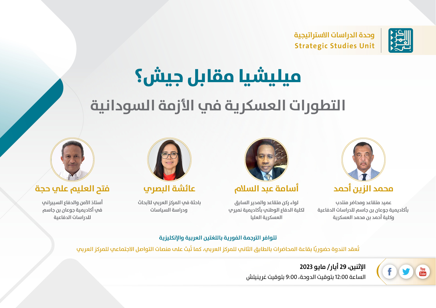 تنظّم وحدة الدراسات الاستراتيجية في المركز العربي للأبحاث ودراسة السياسات يوم الإثنين، 29 أيار/ مايو 2023، في الساعة الثانية عشرة ظهرًا بتوقيت الدوحة، ندوةً بعنوان "ميليشيا مقابل جيش؟ التطورات العسكرية في الأزمة السودانية"، يشارك فيها محمد الزين أحمد، عميد متقاعد ومحاضر منتدب بأكاديمية جوعان بن جاسم للدراسات الدفاعية وكلية أحمد بن محمد العسكرية؛ وأسامة عبد السلام، لواء ركن متقاعد، المدير السابق لكلية الدفاع الوطني بأكاديمية نميري العسكرية العليا؛ وعائشة البصري، الباحثة في المركز العربي؛ وفتح العليم علي حجة، أستاذ الأمن والدفاع السيبراني في أكاديمية جوعان بن جاسم للدراسات الدفاعية.