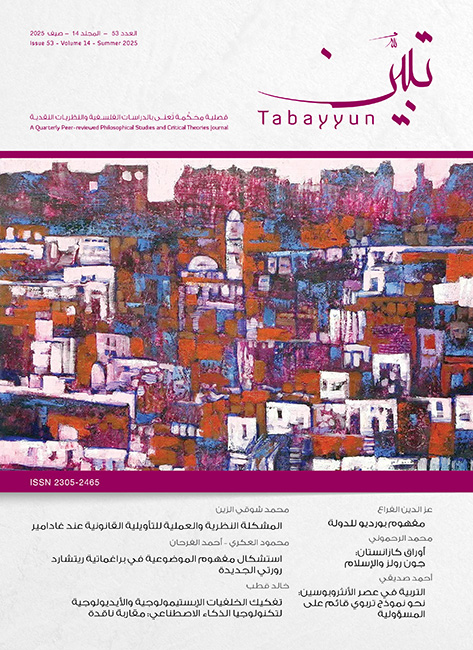​​​صدر عن المركز العربي للأبحاث ودراسة السياسات ومعهد الدوحة للدراسات العليا العدد الثالث والخمسون (صيف 2025) من الدورية المحكّمة تبيُّن للدراسات الفلسفية والنظريات النقدية. وتضمّن هذا العدد ست دراسات: "مفهوم بورديو للدولة" لعز الدين الفراع، و"التربية في عصر الأنثروبوسين: نحو نموذج تربوي قائم على المسؤولية" لأحمد صديقي، و"المشكلة النظرية والعملية للتأويلية القانونية عند غادامير" لمحمد شوقي الزين، و"استشكال مفهوم الموضوعية في براغماتية ريتشارد رورتي الجديدة" لمحمود العكري وأحمد الفرحان، و"تفكيك الخلفيات الإبستيمولوجية والأيديولوجية لتكنولوجيا الذكاء الاصطناعي: مقاربة ناقدة" لخالد قطب.
