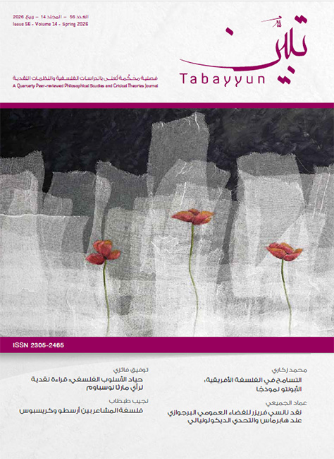 صدر عن المركز العربي للأبحاث ودراسة السياسات ومعهد الدوحة للدراسات العليا العدد السادس والخمسون (ربيع 2026) من دورية "تبيُّن" للدراسات الفلسفية والنظريات النقدية. وتضمّن أربع دراسات: "التسامح في الفلسفة الأفريقية: الأبونتو نموذجًا" لمحمد زكاري، و"نقد نانسي فريزر للفضاء العمومي البرجوازي عند هابرماس والتحدي الديكولونيالي" لعماد الجميعي، و"حياد الأسلوب الفلسفي: قراءة نقدية لرأي مارثا نوسباوم" لتوفيق فائزي، و"فلسفة المشاعر بين أرسطو وكريسبوس" لنجيب طبطاب.