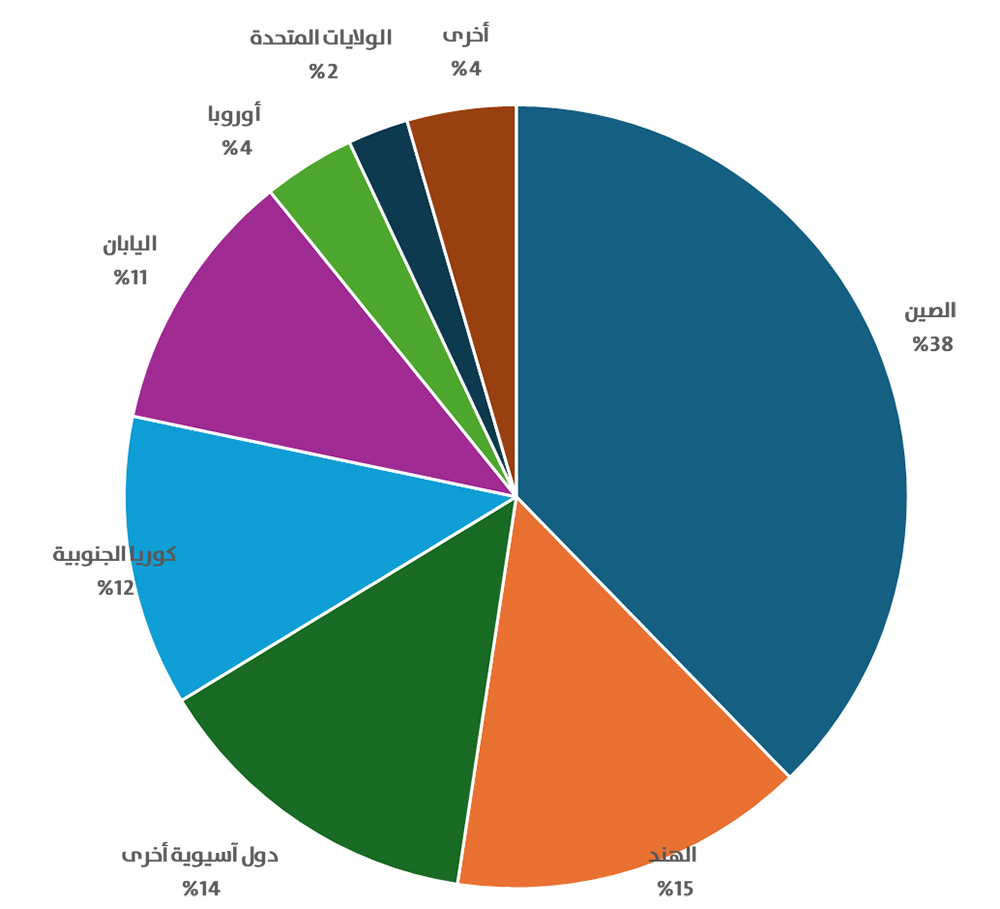 حصة الدول والمناطق من واردات النفط والمكثفات عبر مضيق هرمز (14.2 مليون برميل يوميًا) في الربع الأول 2025