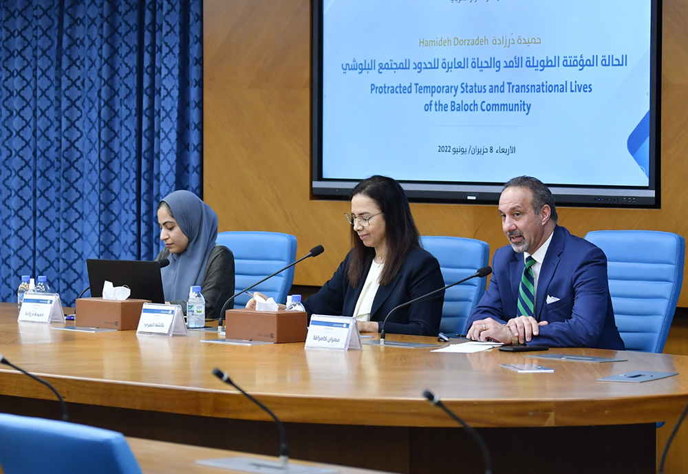 On 8 June 2022, Hamideh Dorzadeh, Assistant Researcher and Coordinator of the Iranian Studies Unit at the Arab Center for Research and Policy Studies (ACRPS), presented her research project titled “Protracted Temporary Status and Transnational Lives of the Baloch Community,” as part of the ACRPS seminar series.