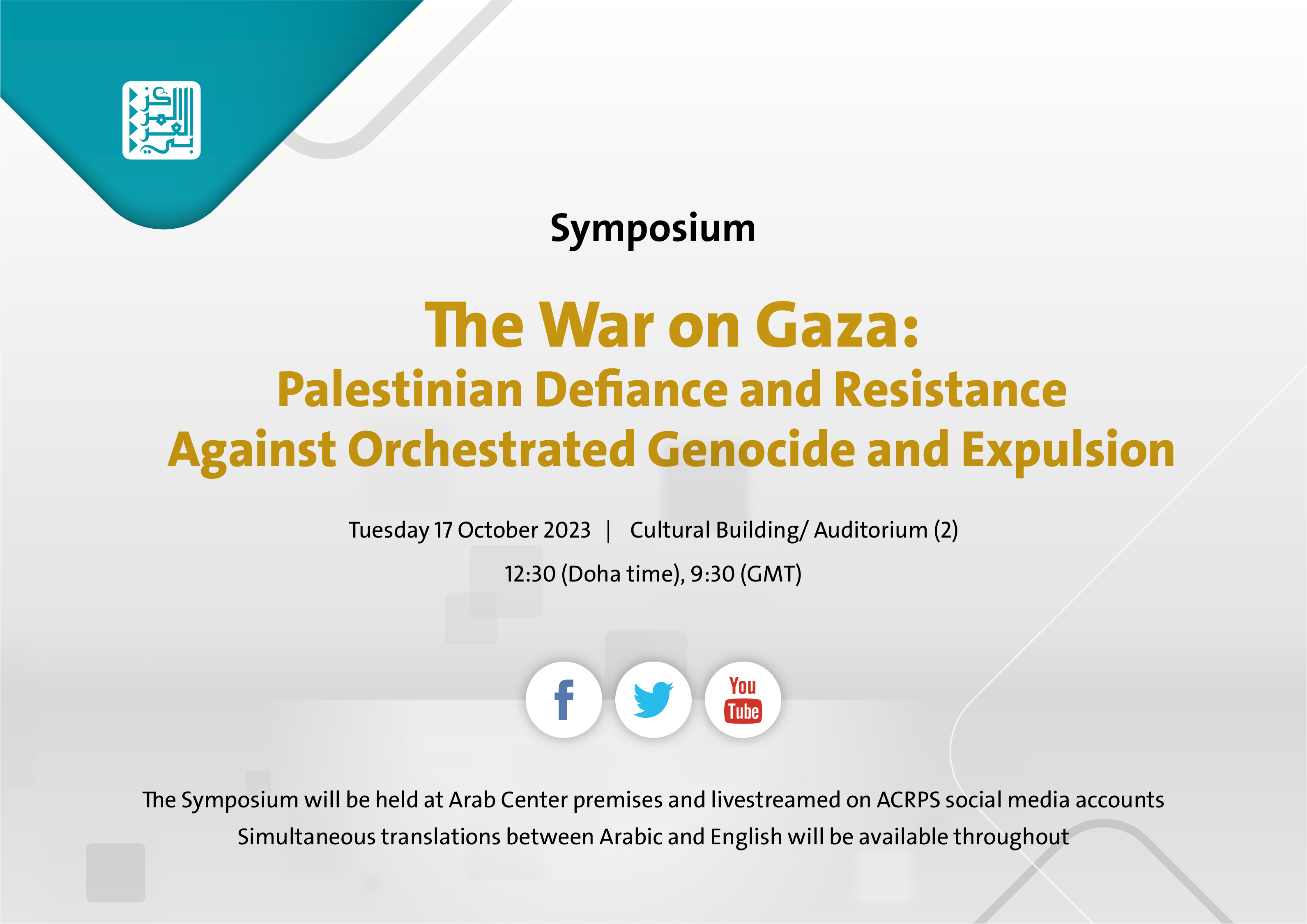 The symposium will be held on Tuesday, 17 October 2023, at the Arab Center for Research and Policy Studies, Cultural Building, Auditorium (2) at 12:30 Doha time, 9:30 GMT.