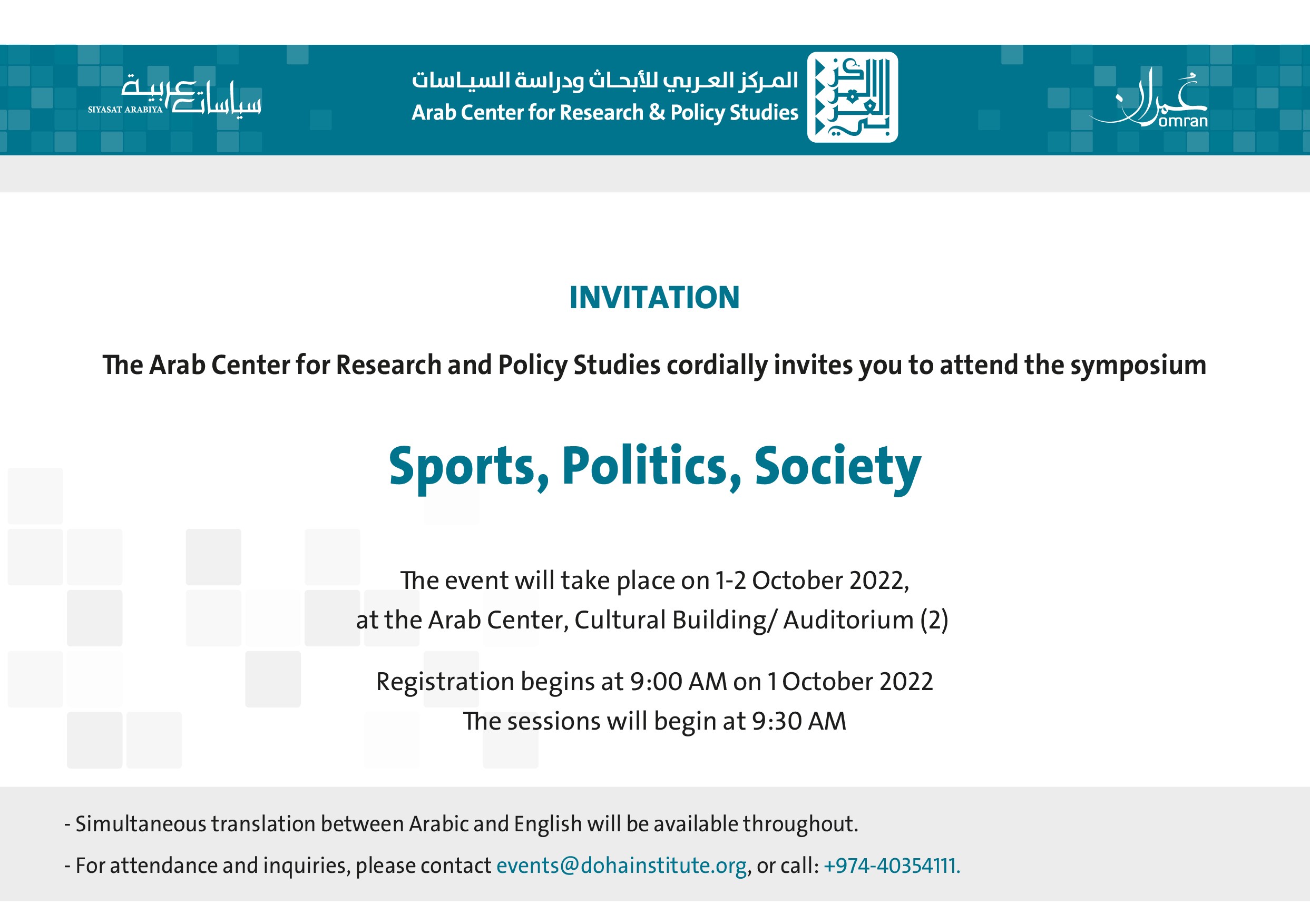 The Arab Center for Research and Policy Studies cordially invites you to attend the symposium Sports, Politics, Society, to be held in Doha on 1-2 October 2022.