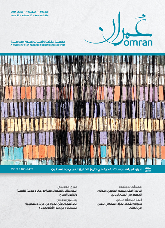Omran, dedicated to the social sciences. This special issue on “Water Ways: Critical Studies in the History of the Arabian Gulf and Palestine,” includes an introduction by the guest editor, Ismail Nashef, in addition to 4 articles “The Sailing Scribe: Mansur Al-Khariji and the Oceanic Worlds of the Gulf” by Fahad Ahmad Bishara; “The Drought Years: The Forgotten Economic Transformations in Gulf History” by Amna Abdulla Sadiq; “The Sea vs. the Desert: Rahmah ibn Jabir and the Dialectic of Piracy and Maritime Influence” by Faozi Al-Goidi; and “Star-Tied Water: Tracing Life in a Colonized Palestinian Village during the Time of the Anthropocene” by Yasmeen Qadan. In addition, the articles section includes a study titled “The Illusion of the Tunisian Exception: Civil Society and Democratic Transition” by Mehdi Mabrouk.