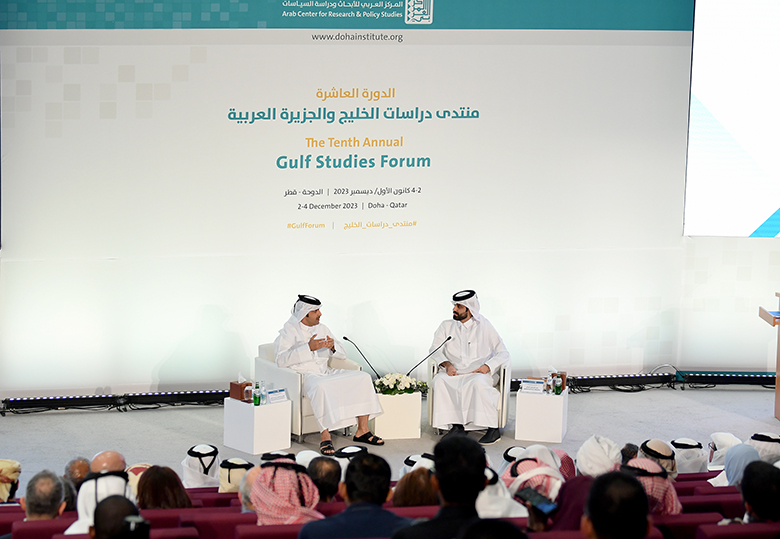 The 10th Annual Gulf Studies Forum, held by the Arab Center in Doha from 2-4 December 2023, came underway in Doha on Saturday 2 December. At the end of the first day’s proceedings, Minister of Culture of the State of Qatar Sheikh Abdulrahman bin Hamad Al Thani took part in a dialogue session chaired by Abdulrahman Albaker, collaborating researcher at the ACRPS Gulf and Arabian Peninsula Studies Unit.