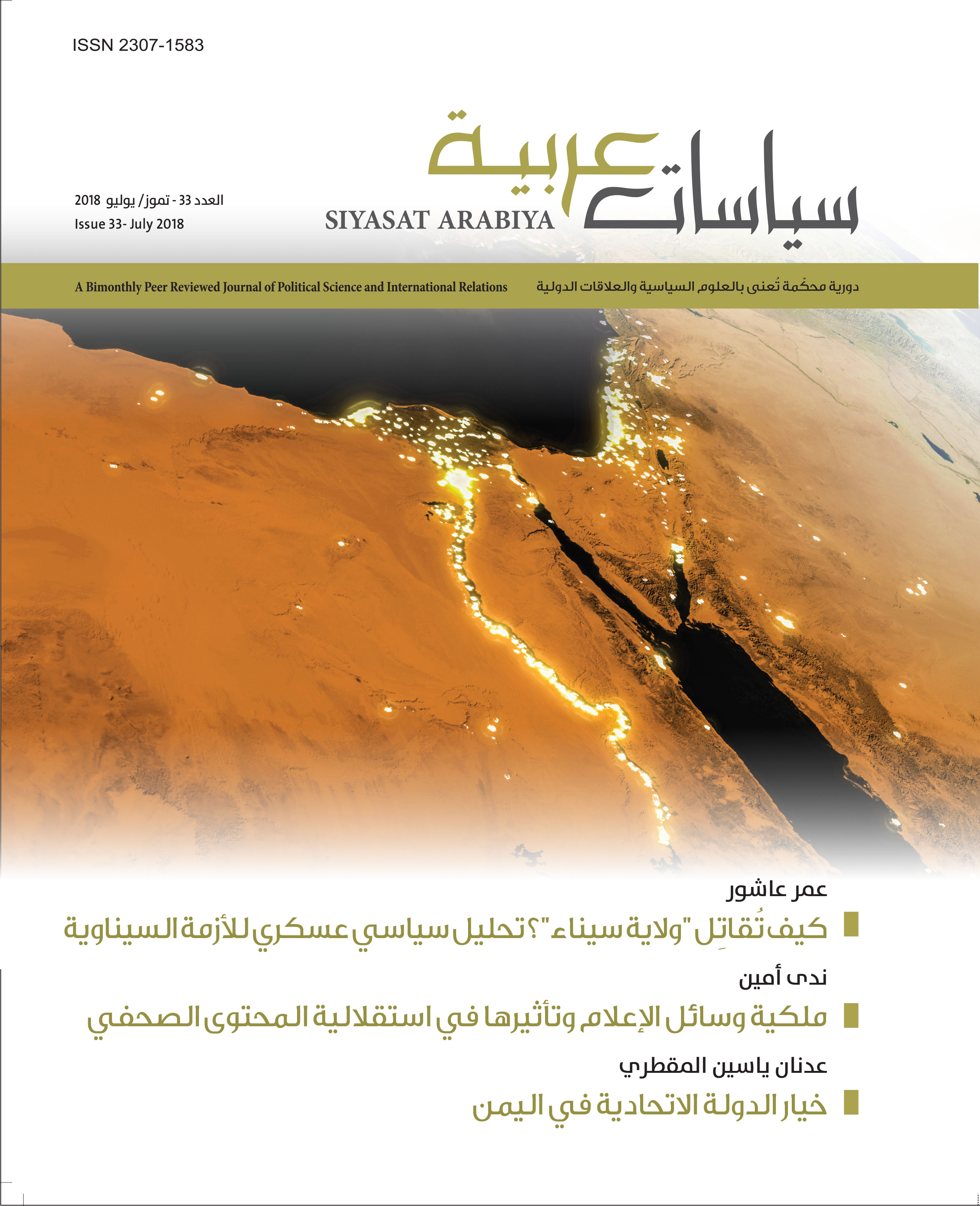 The thirty-third issue of Siyasat Arabiya, the bi-monthly Political Science and International Relations journal published by the Arab Center for Research and Policy Studies, is now available. This edition includes the studies "Sinai's Insurgency: Implications of Enhanced Guerilla Warfare" by Omar Ashour; "The New Approach to the Kurdish Issue in Turkey" by Emad Kaddorah; "The Federal State Option in Yemen: Backgrounds, Justifications and the Challenges of Transition" by Adnan Yassin Al-Maktary; "The Experience of Palestinian Technocrats: The Governments of Hamdallah as a Case Study" by Ihab Maharmeh; "Measuring the State's Economic Power Adopting the Delphi Technique in the Study of the Reality of the Arab Countries 2015, Compared to the Regional Countries" by Bashar A. AL-Iraqi; "Ownership of Media and the Impact on the Independence of Journalistic Content: the Case of Sudan" by Nada Amin.