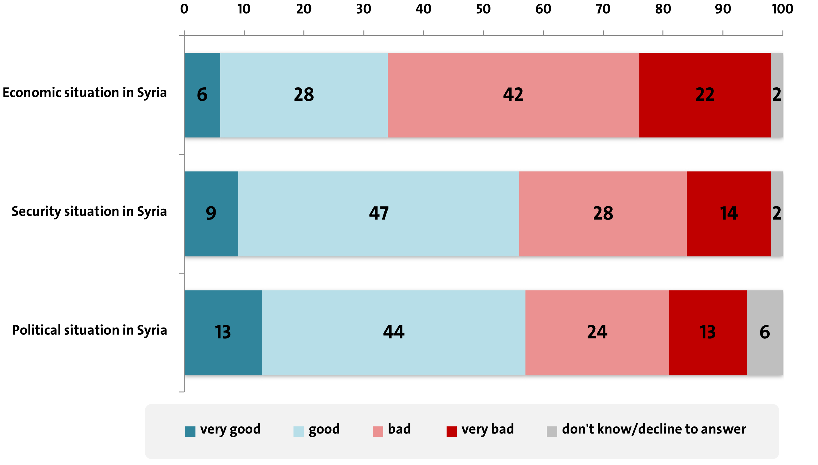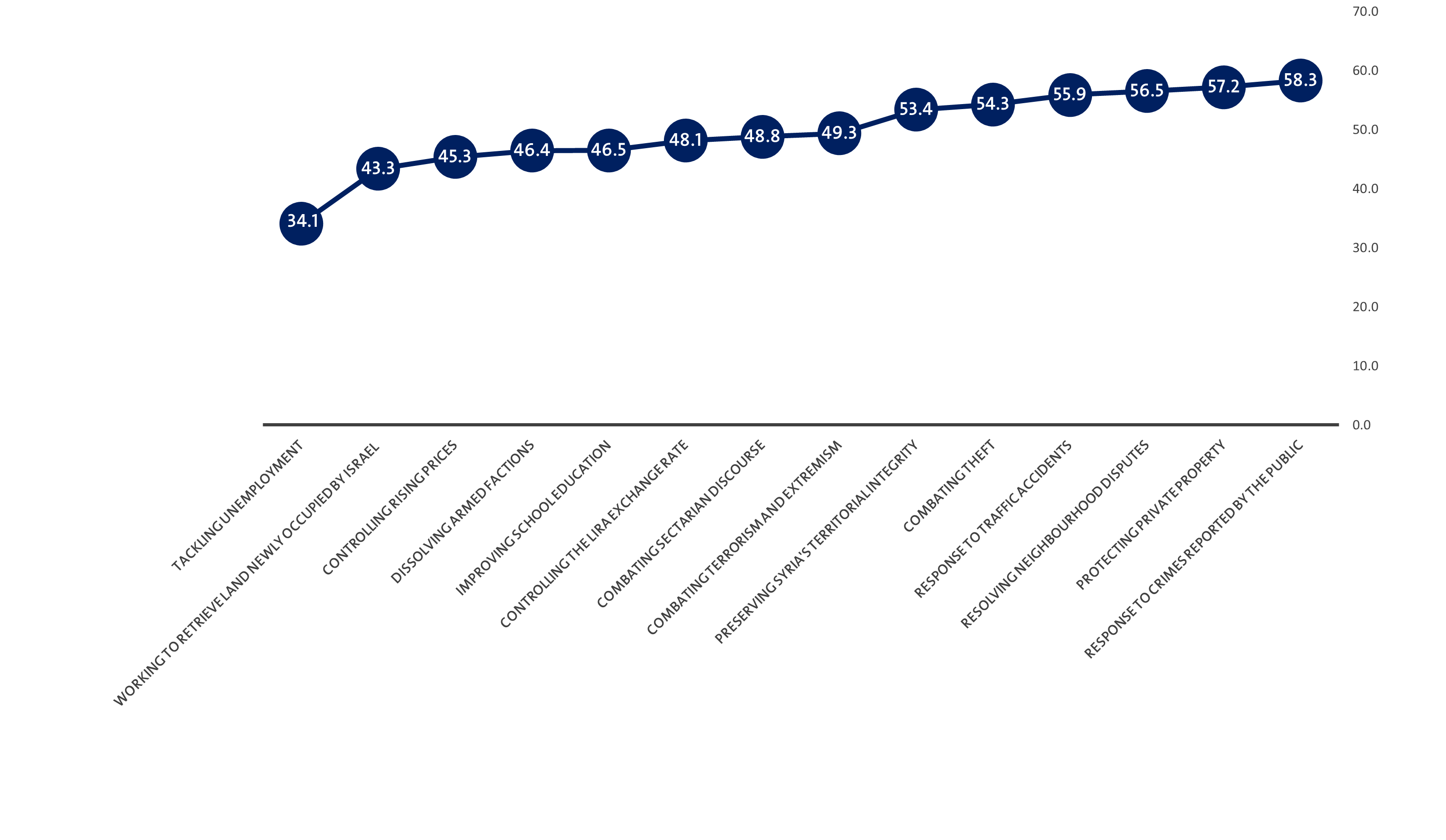 Political and security issues were top priorities for Syrian respondents. Fifty-one percent said that the most important problems facing the country today involve the risk of partitioning Syria, instability, external interventions, the incursion of Israeli occupation forces into Syrian territory, or insecurity.