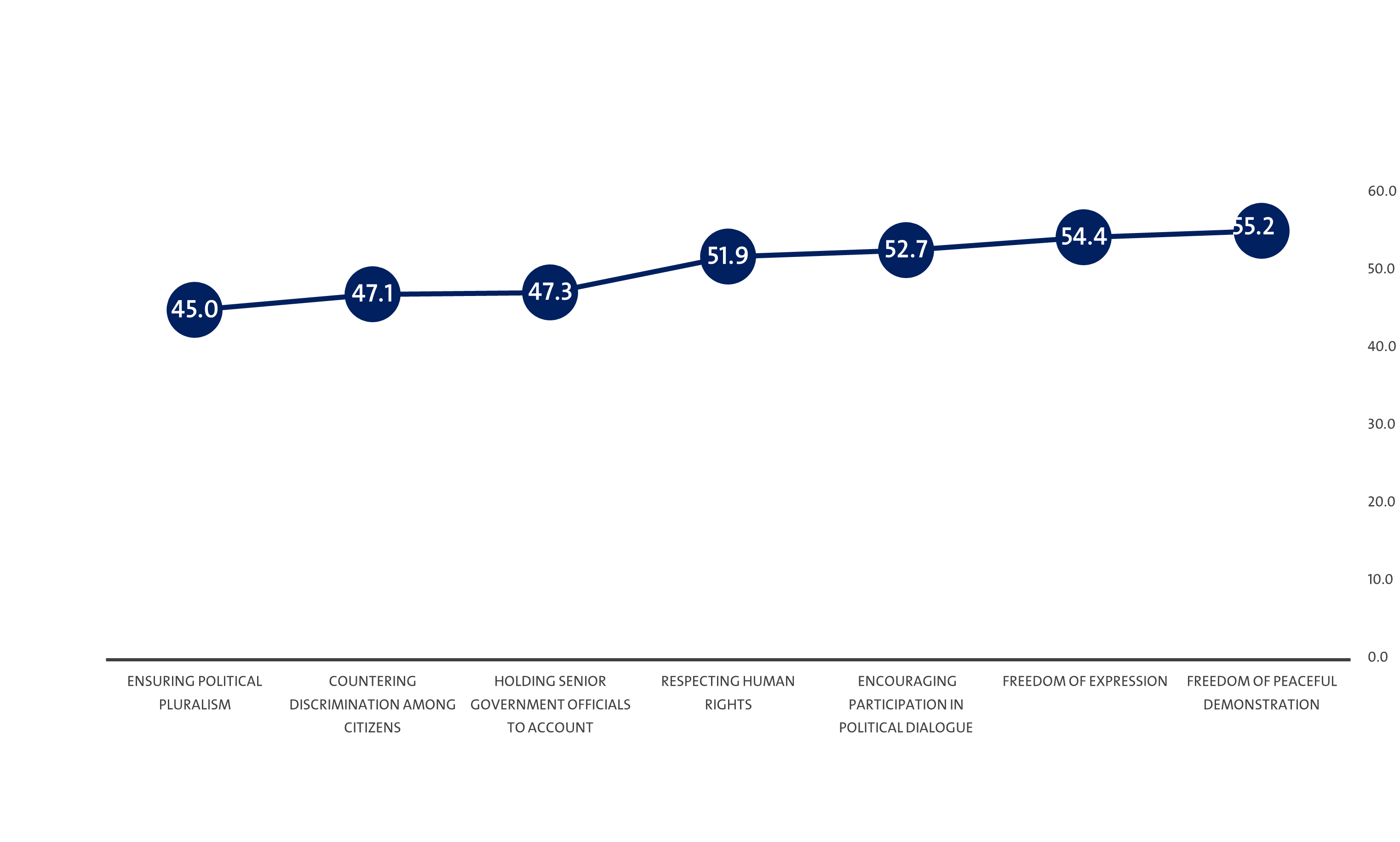 ​More than half of respondents agreed that the government had succeeded in respecting human rights, encouraging citizen participation in political dialogue, ensuring freedom of expression, and respecting the right of free assembly. Conversely, the majority saw governmental failure in ensuring political pluralism, ending discrimination between citizens, and delivering accountability from senior government officials (figure 2f).