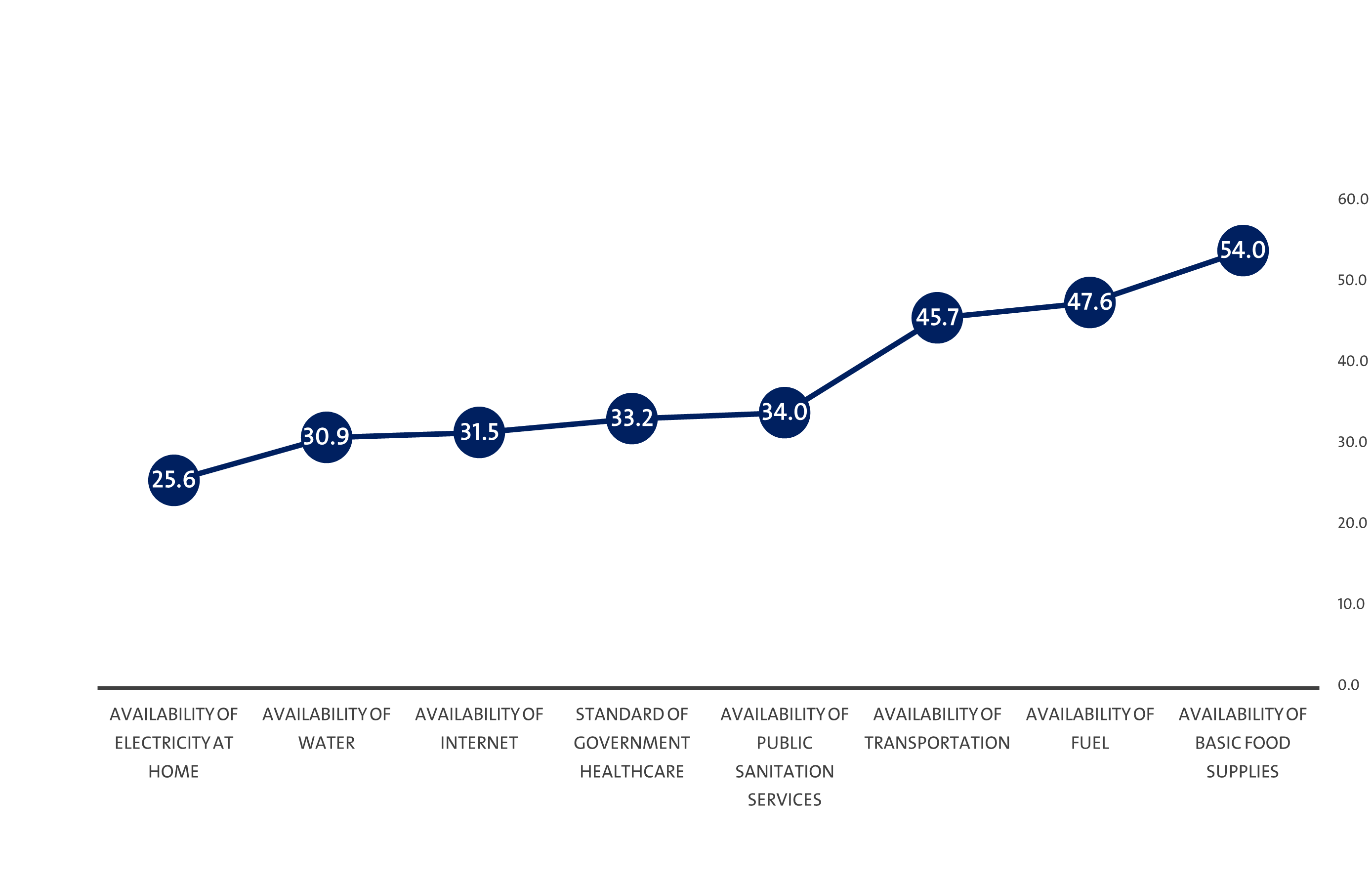 More than half of respondents expressed that basic foodstuffs are widely available, while about half of respondents reported a wide availability of fuel. About 30 percent reported a good water supply, and 25 percent reported a reliable electricity connection at home (figure 2g).