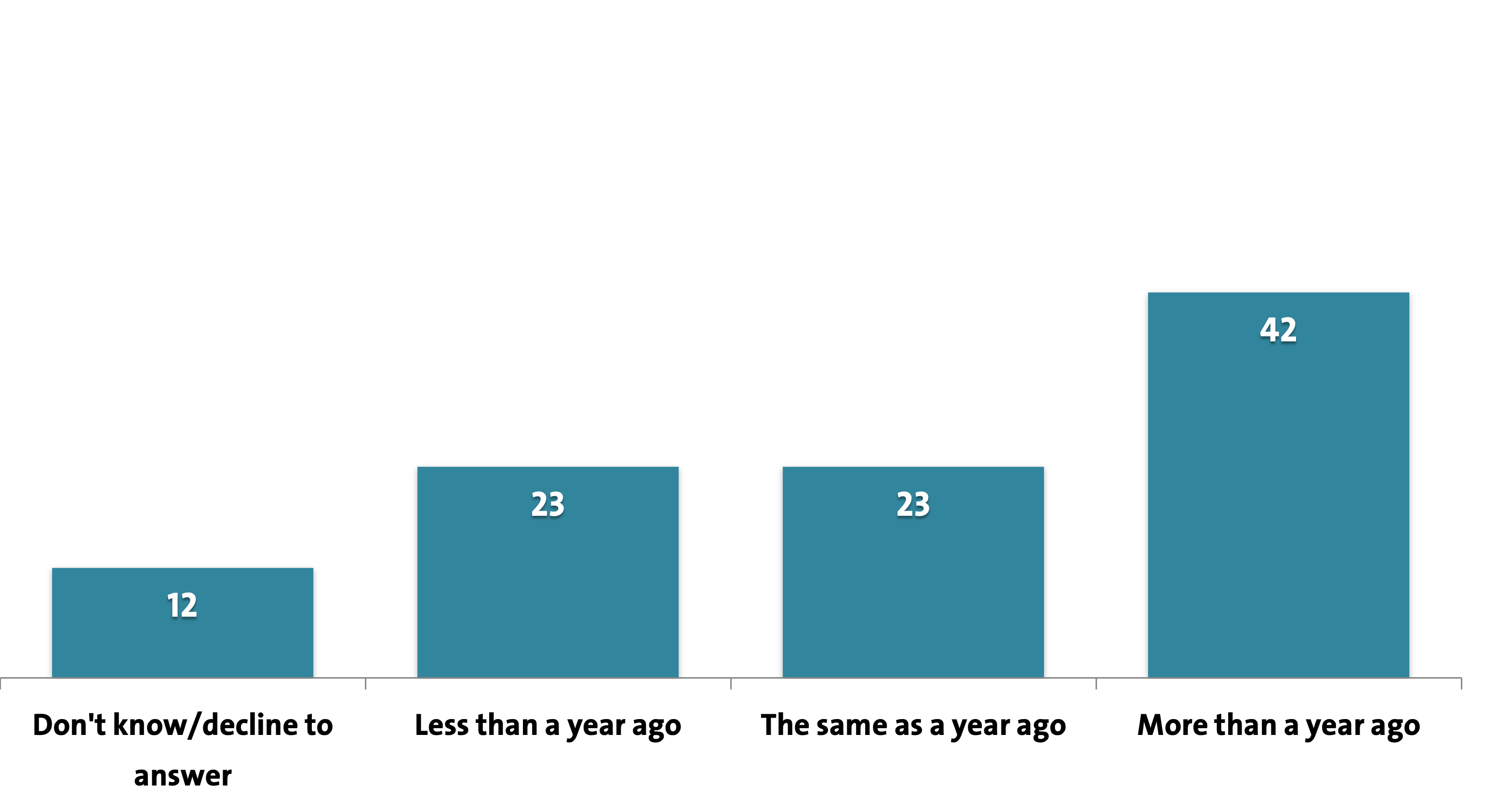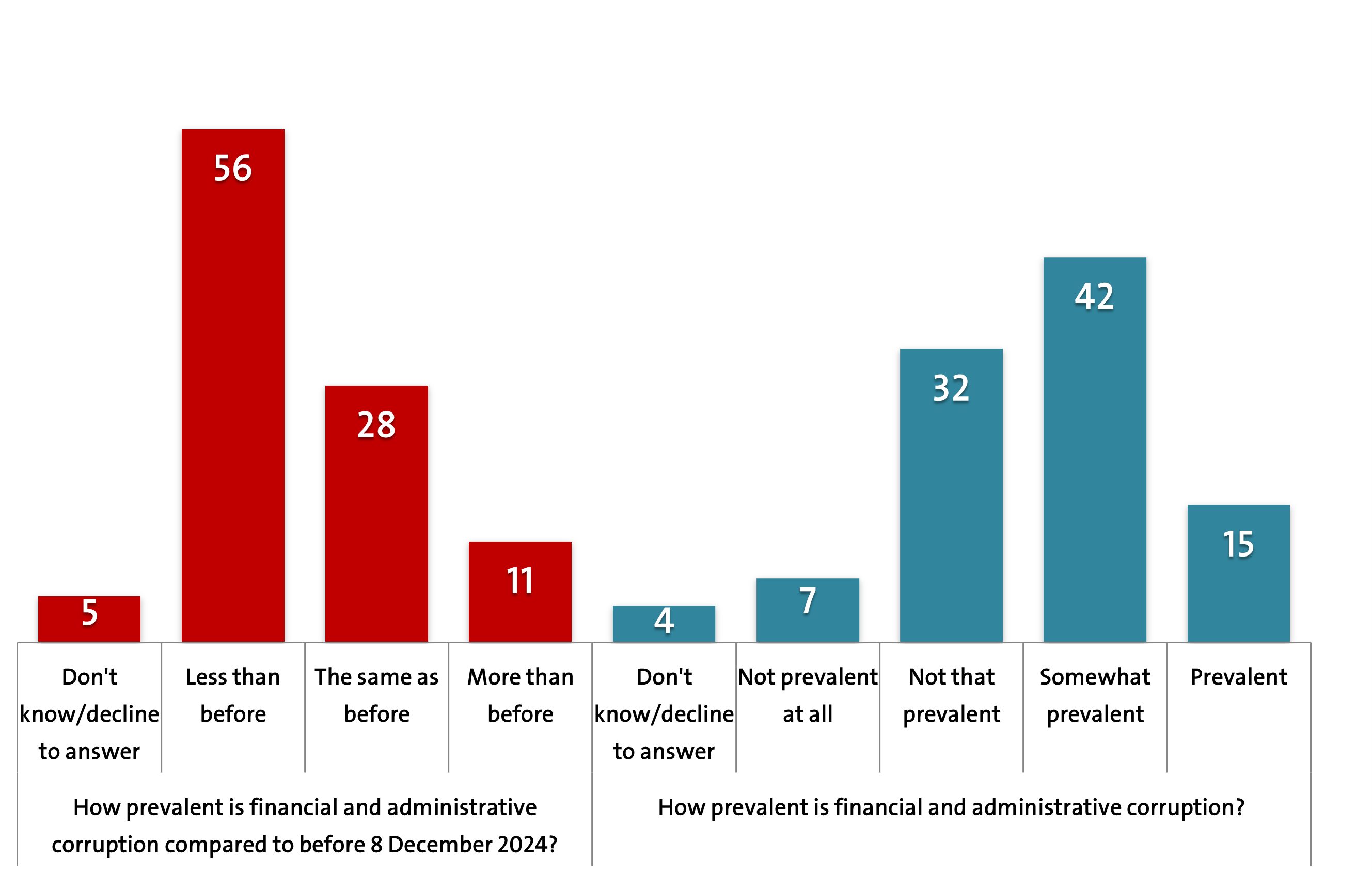 The survey revealed a perception of widespread financial and administrative corruption. Eighty-nine percent of respondents reported that it was widespread in varying degrees; only 7 percent reported that it was not widespread at all. Importantly, 56 percent of the respondents believe that the prevalence of financial and administrative corruption has decreased since the Assad regime fell (figure 2h).