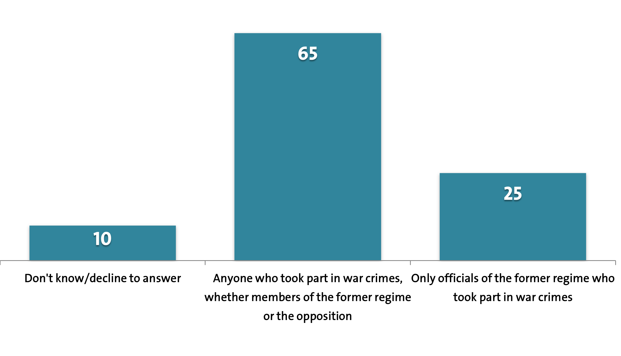 65 percent said that transitional justice should include anyone implicated in crimes, even if they were from the opposition or armed factions, while 25 percent of respondents believed that transitional justice should only include former regime figures (figure 2i).