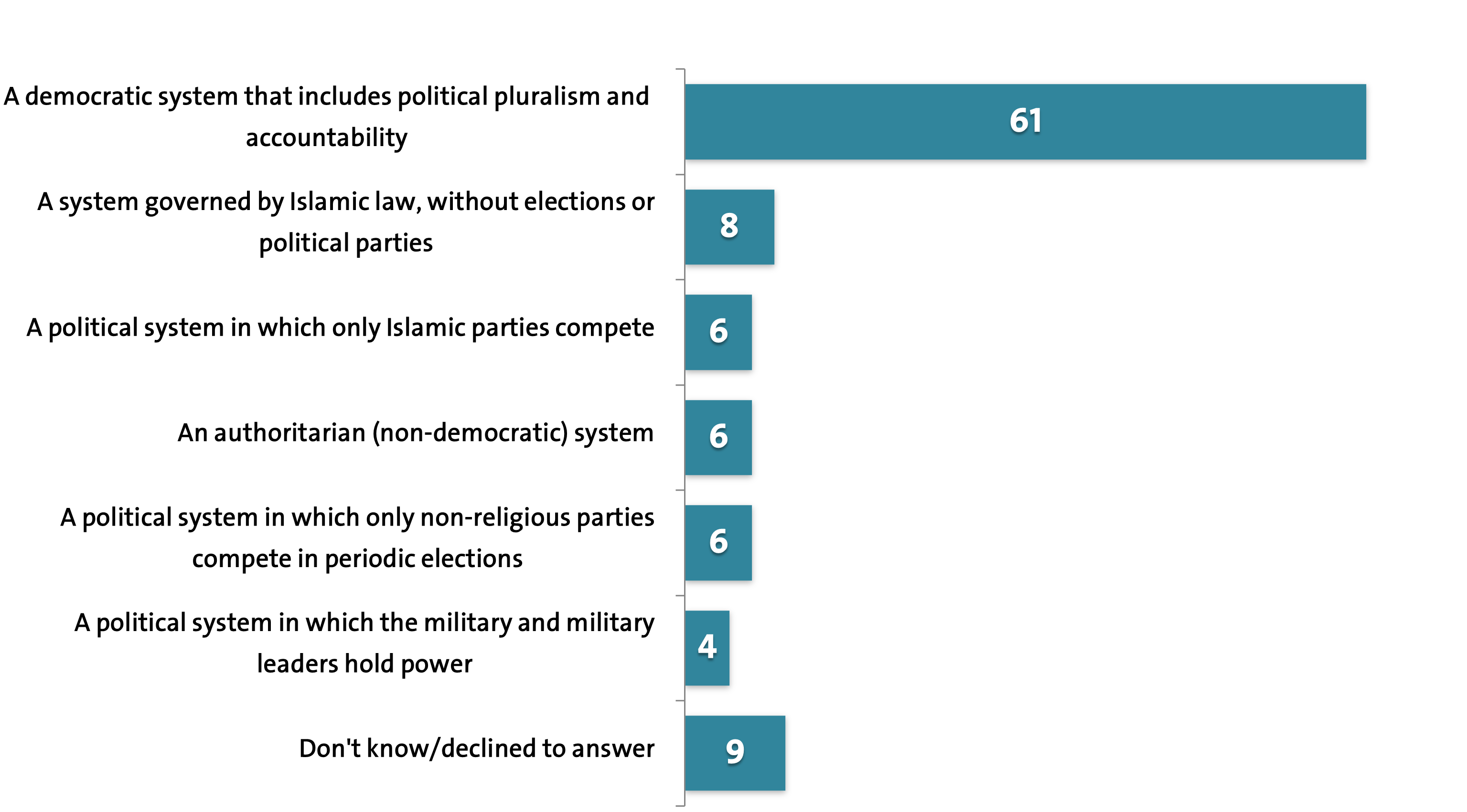 Most survey respondents agreed with democratic principles. Most rejected the negative arguments often raised by opponents of democracy; the majority believed that “the democratic system does not conflict with Islam” and rejected arguments that democracy is associated with poor economic performance or is not good at maintaining public order. Sixty percent of Syrians agreed that democracy, despite its problems, is better than other systems of government; 20 percent disagreed (figure 3a). Sixty-one percent affirmed that democracy is the best system of government for Syria today. Support for other systems of government stood at less than 10 percent for each category (figure 3b).