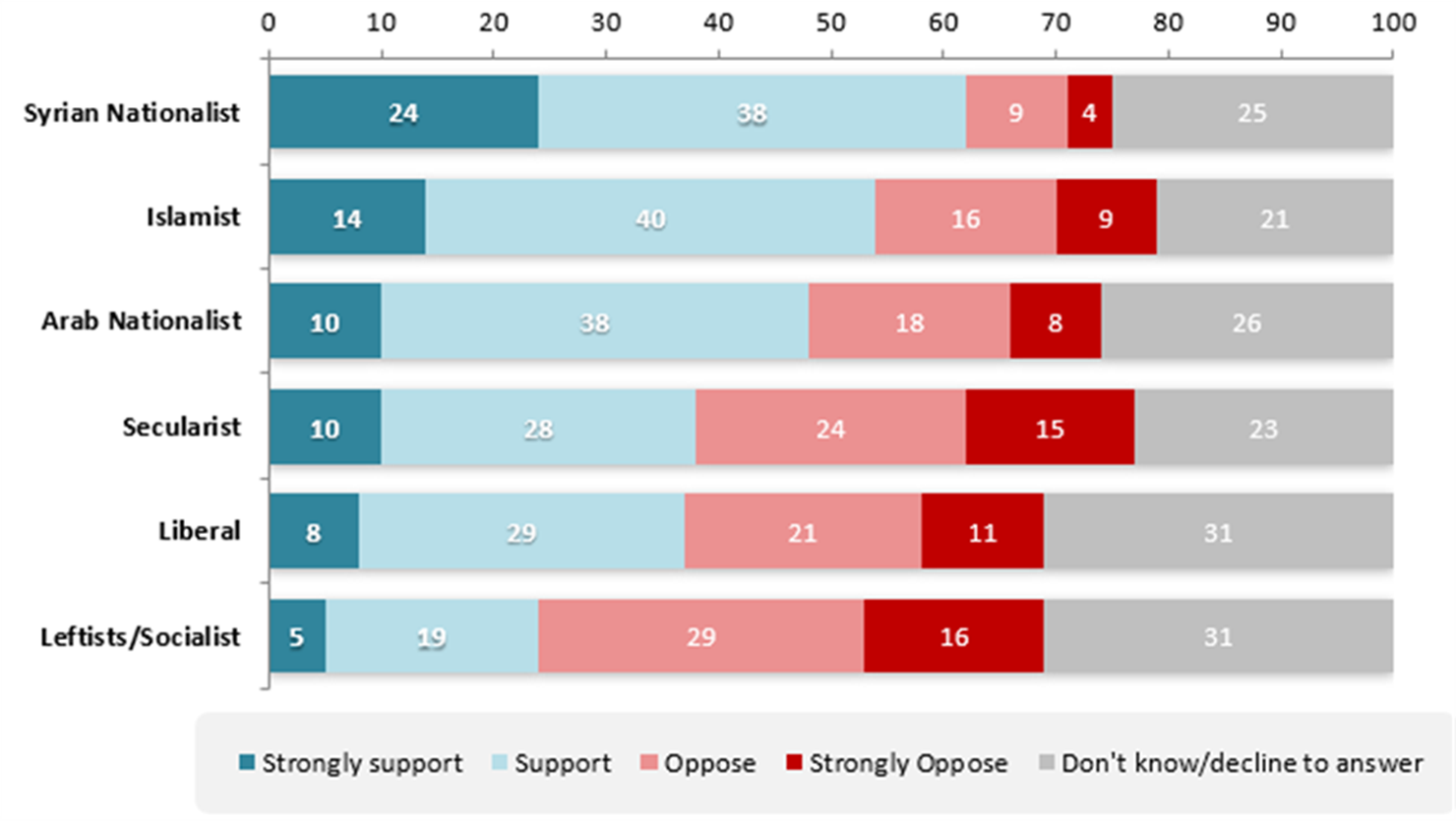 Fifty-three percent of respondents said that they would accept the rule of a political party with which they disagreed if it received a majority of votes in free and fair elections (figure 3c). Syrian public opinion supports the existence of more than one political party in Syria in general, as well as Syrian nationalist political movements and Islamist currents. The largest bloc of respondents also supported the presence of Arab nationalist and liberal currents (figure 3d).