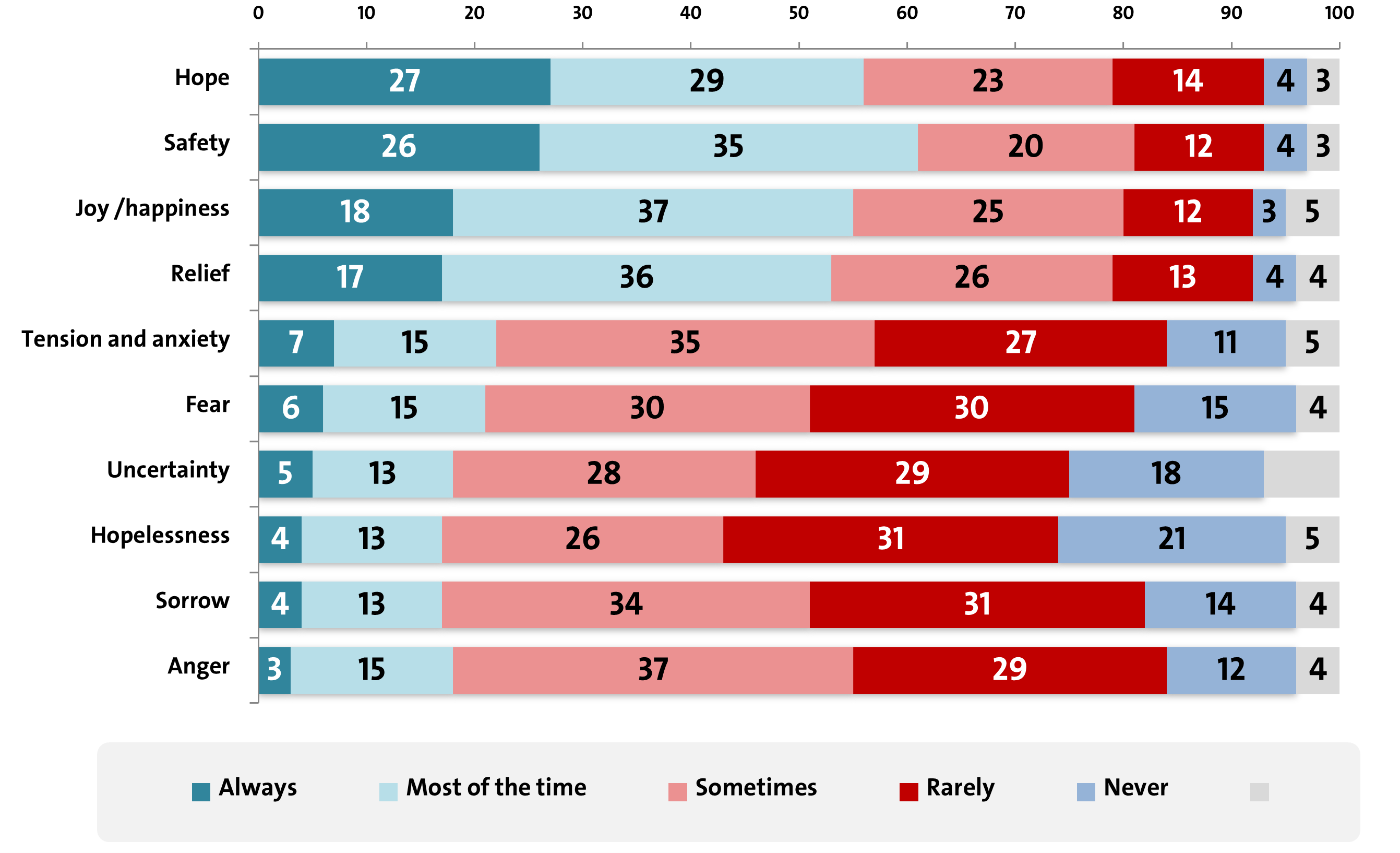 The results reveal that a sense of optimism is widespread in Syria. Fifty-six percent of respondents reported that Syria is heading in the right direction, as opposed to 25 percent who disagreed (figure 1a). When asked to explain in an open-ended question, optimistic respondents identified contributing factors such as the December 2024 fall of the regime of President Bashar al-Assad, the liberation of detainees and prisoners, improved security conditions, and the removal of sanctions. A clear majority of Syrians (79 to 81 percent) reported positive emotions such as hope, joy/happiness, safety, and relief following the regime’s fall. Negative feelings such as tension and anxiety, fear, uncertainty, hopelessness, sorrow, and anger were present at lower levels, ranging between 43 to 57 percent (figure 1b). Moreover, fifty-seven percent of respondents said that the political situation in Syria was very good or good, while 56 percent reported the same for the security situation. Most respondents, however, considered the economic situation to be bad or very bad (figure 1c).