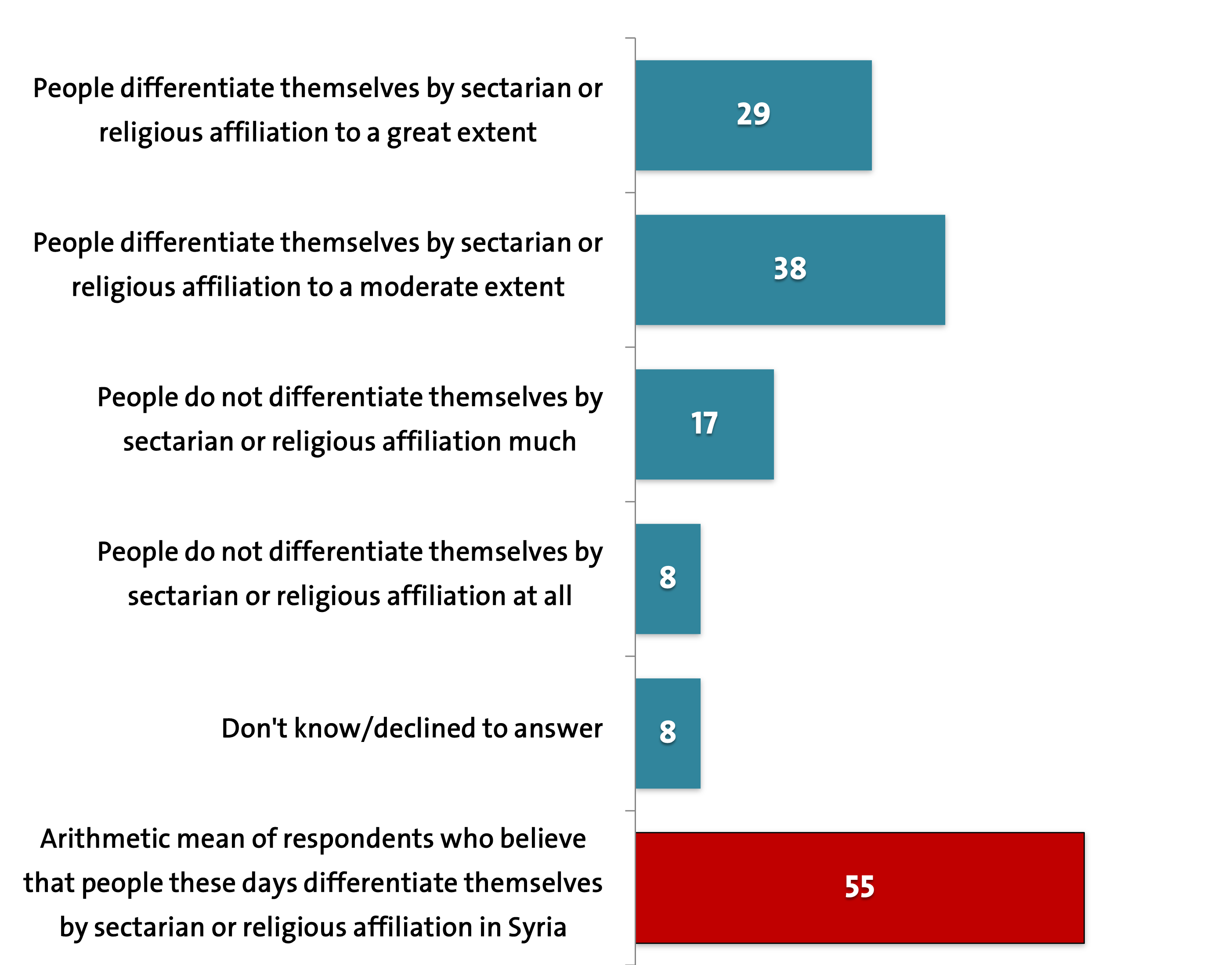 Nineteen percent of respondents believed that the most important factor shaping national identity is a shared Syrian culture, followed by the Arabic language (17 percent), living in Syria (10 percent), social and cultural diversity (9 percent), and Islam (8 percent). Eighty-five percent of respondents reported that “sectarian rhetoric” is widespread. 84 percent believed that Syrians today identify themselves and others based on sectarian and religious affiliation. Eighty-three percent of respondents believed that discrimination between people based on their sects and religions was widespread in the country.