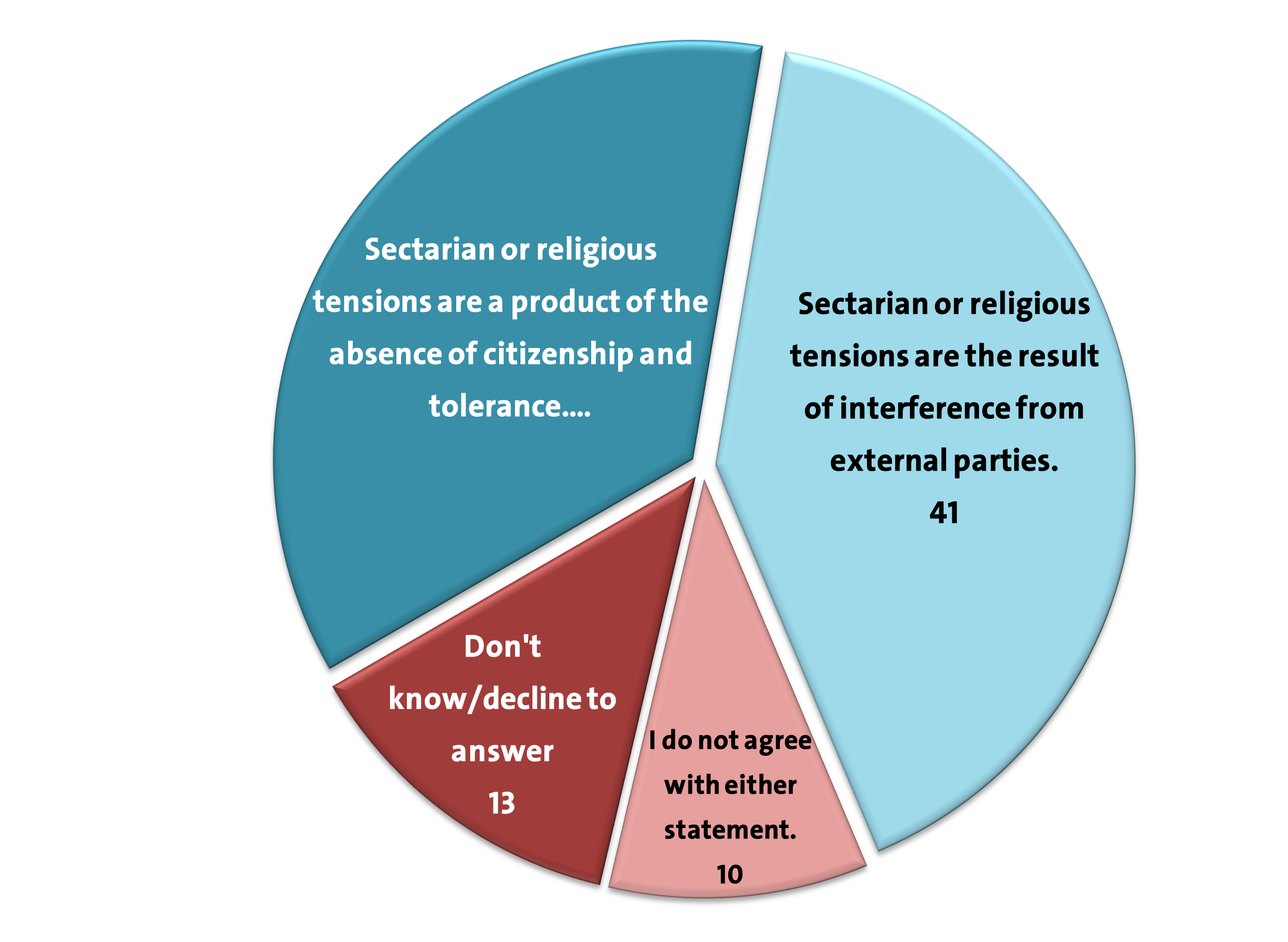 A further 67 percent of respondents agreed with the statement, “No one has the right to question the patriotism of any member of society or their belonging to the homeland because they oppose government policies.” Forty-one percent of respondents believed that tension between citizens based on sect or religion was the result of interference from external parties, compared to 36 percent who believed it was the result of a lack of the principles of citizenship and tolerance.