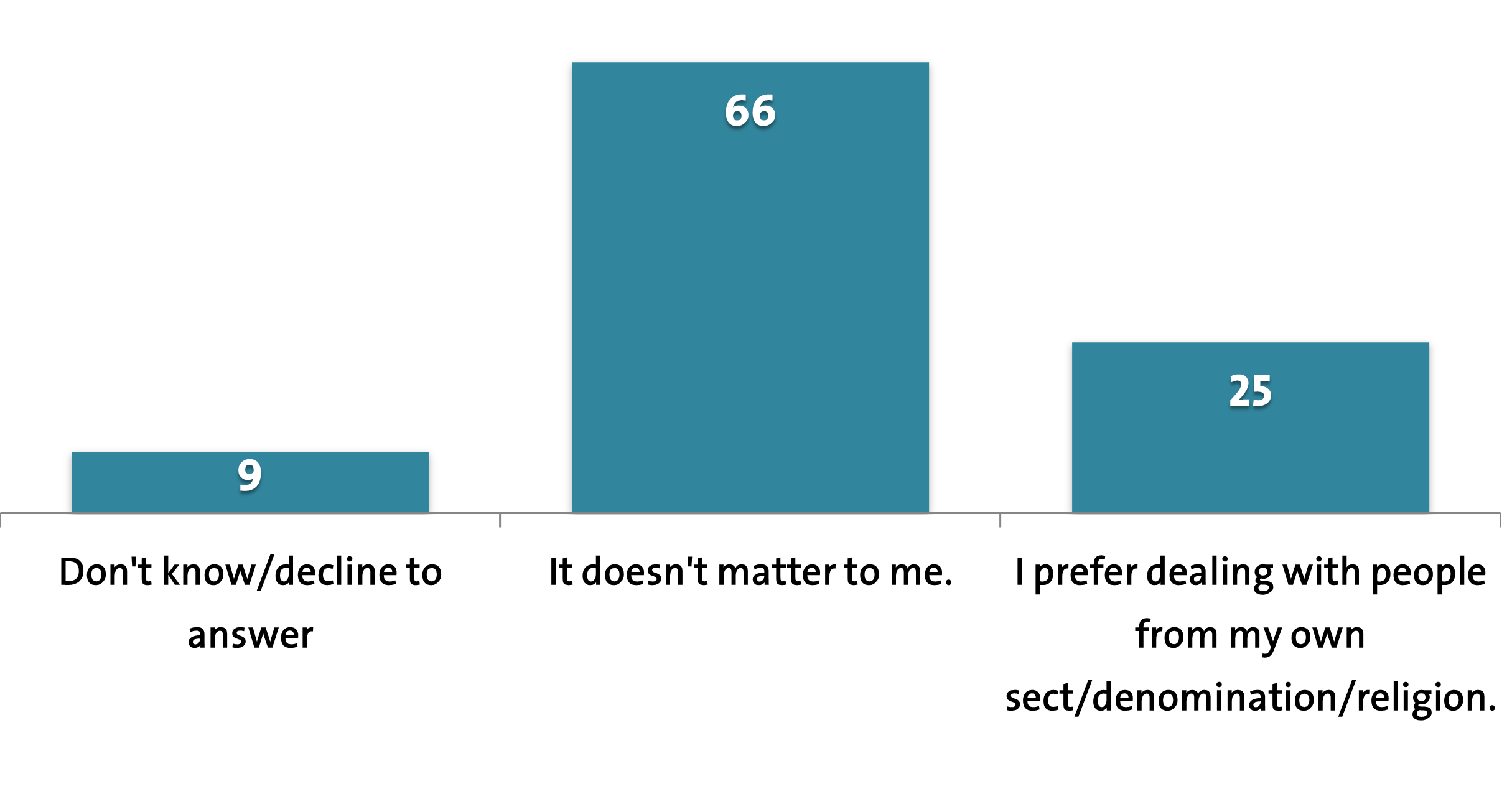 Fifty-eight percent of respondents reported that they did not differentiate between religious and non-religious people, compared to 21 percent who preferred to deal with religious people and 15 percent who preferred to deal with non-religious people (figure 7c). Meanwhile, 57 percent of respondents believed that “it is better for the country to separate religion from politics,” compared to 30 percent who said that religion should not be separated from politics (figure 7d).