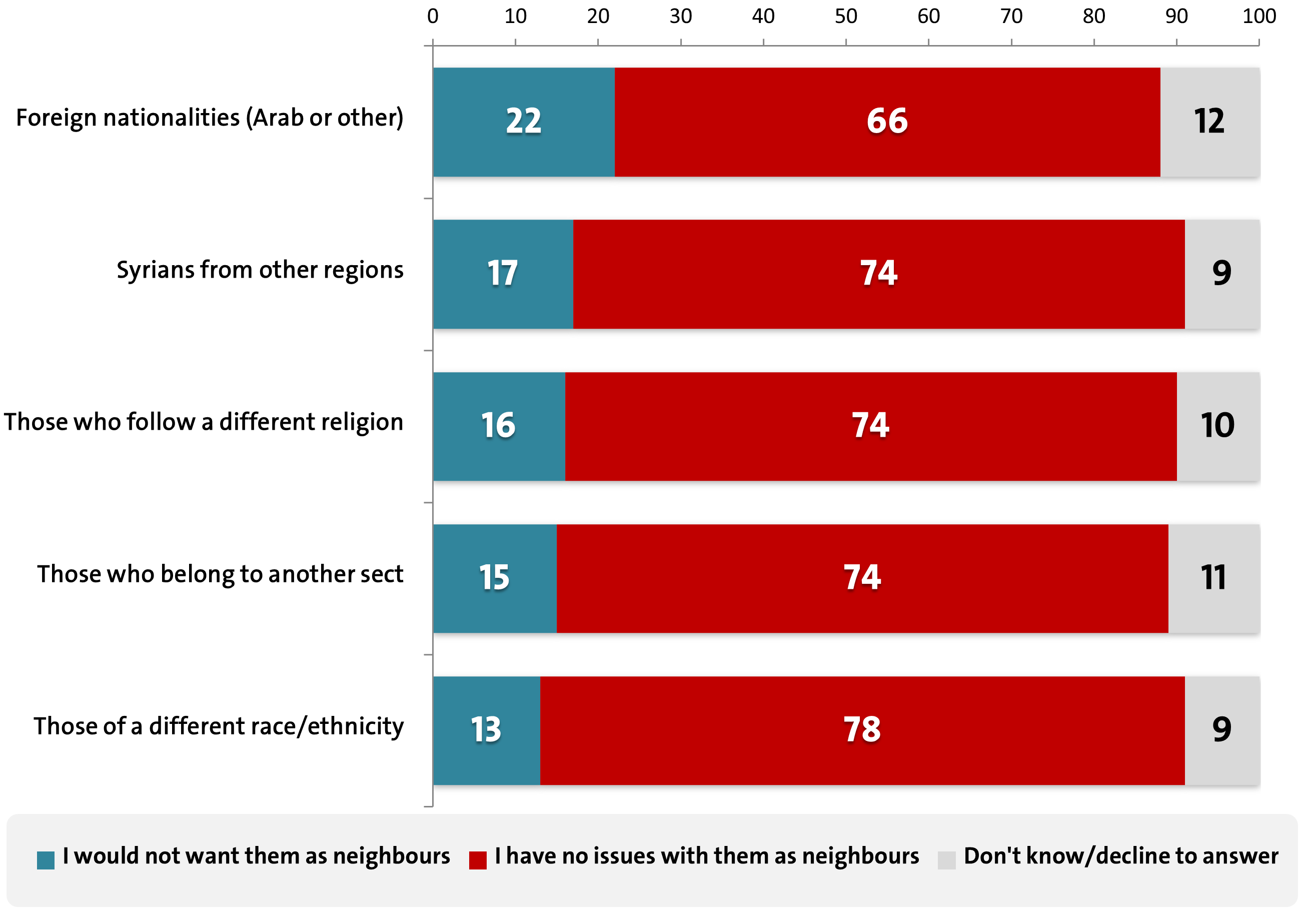 Some 44 percent of respondents agreed with the statement, “The former regime relied on people it trusted and their loyalty, regardless of their sect.” Although Syrians acknowledged the existence of sectarian rhetoric, 66 percent of respondents reported that they saw no difference in dealing with others regardless of their sect or religion. Twenty-five percent of respondents preferred dealing with people from the same sect. Syrians agreed, by a range of 66 percent to 78 percent, that they did not mind their neighbours being from other religions, sects, and ethnicities, and that they rejected all forms of discrimination.