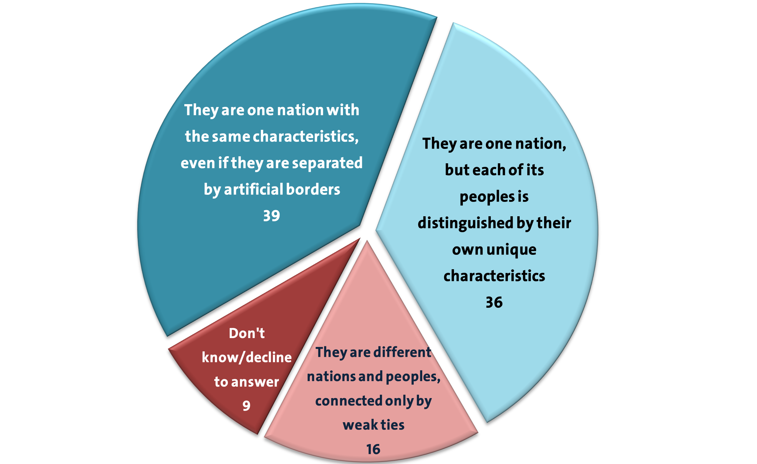 Seventy-five percent of respondents agreed that the people of the Arab region represent a single nation. They stated that the Arab peoples constitute either a single nation with common characteristics, even if separated by artificial borders, or a single nation with distinct characteristics for each of its peoples. However, 16 percent said the Arabs are different peoples and nations with weak ties.