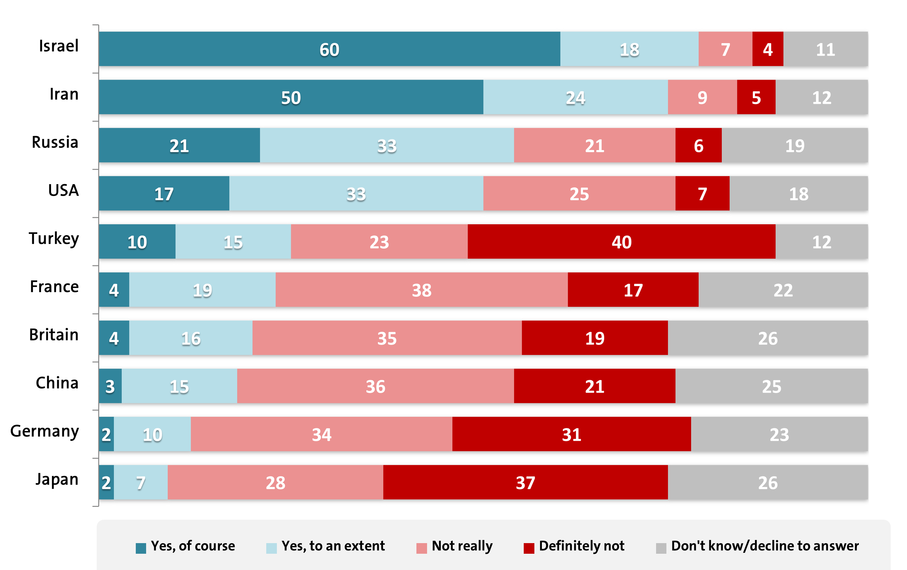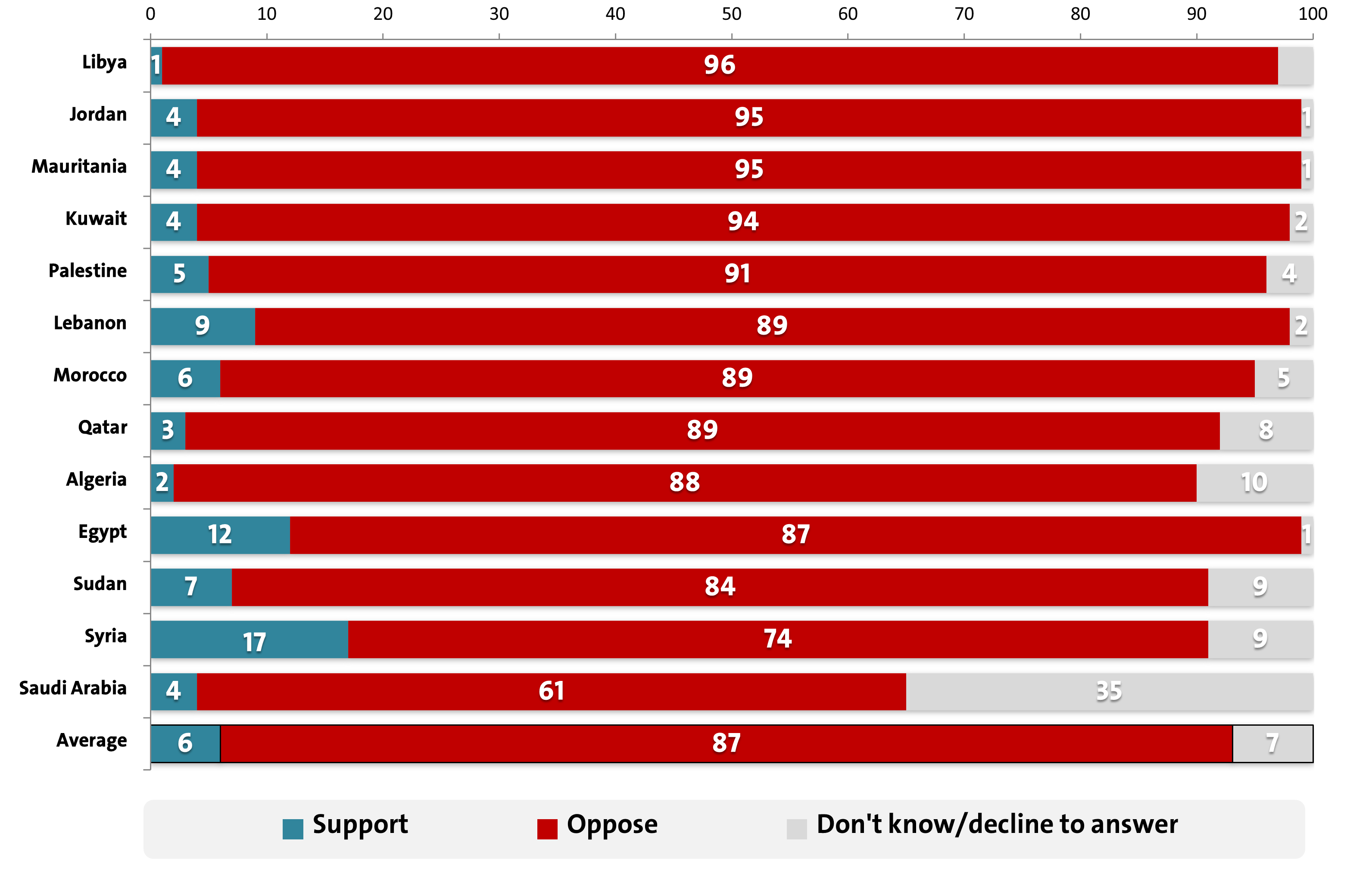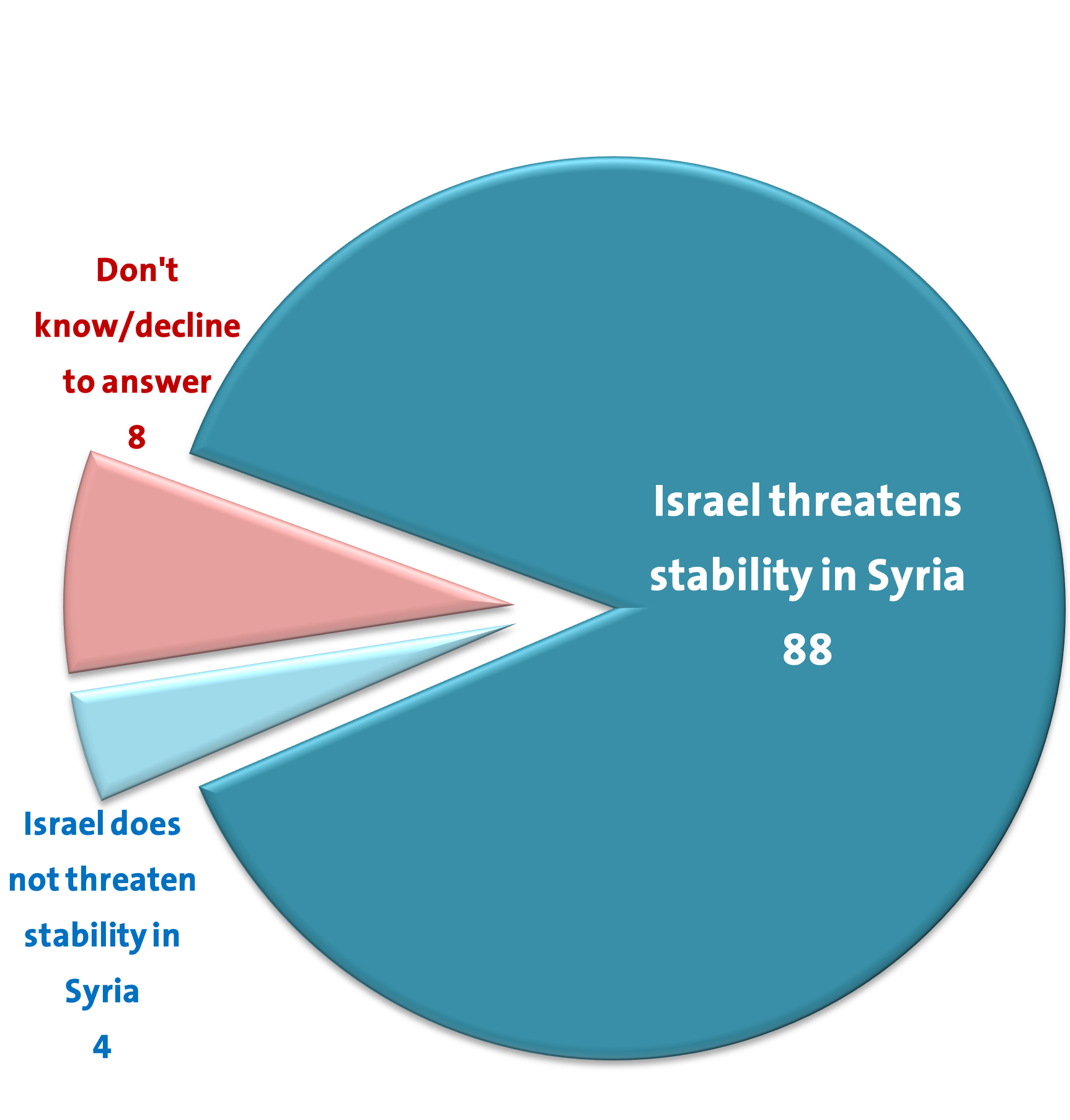 Syrians believe that Israel is the greatest threat to the security and stability of the Middle East, with 78 percent agreeing that Israel is the country that poses the greatest threat to the security of the Arab world. A further 55 percent of respondents believe that Israel is the country that poses the greatest threat to Syria’s security and stability, followed by Iran at 14 percent.