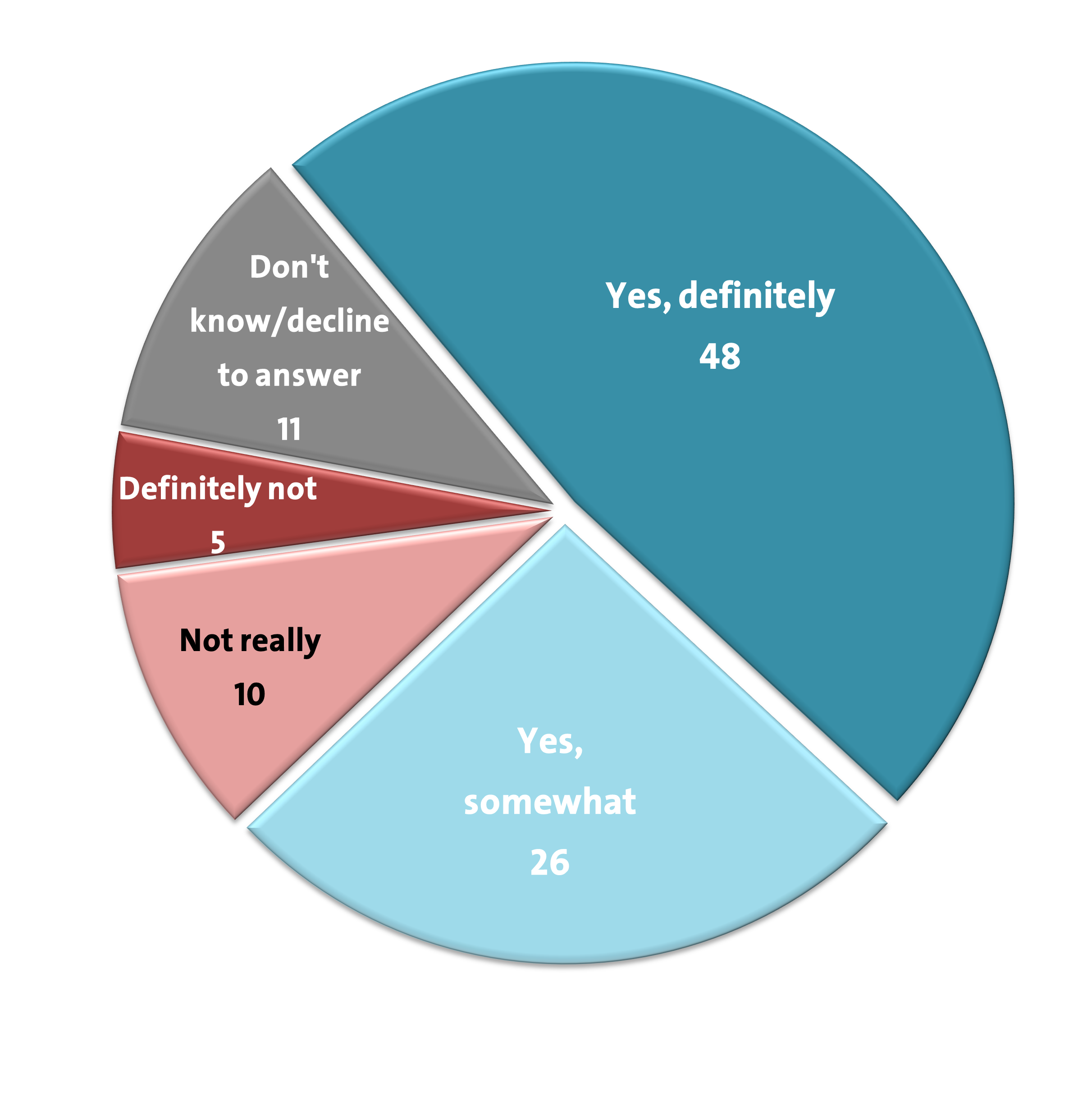 Sixty-one percent of respondents believed that the foreign policy of the current government reflected the views of the Syrian people, while 25 percent said it did not (figure 2c). Similarly, 59 percent reported that the government’s economic policy reflected their views; 31 percent said it did not (figure 2d).