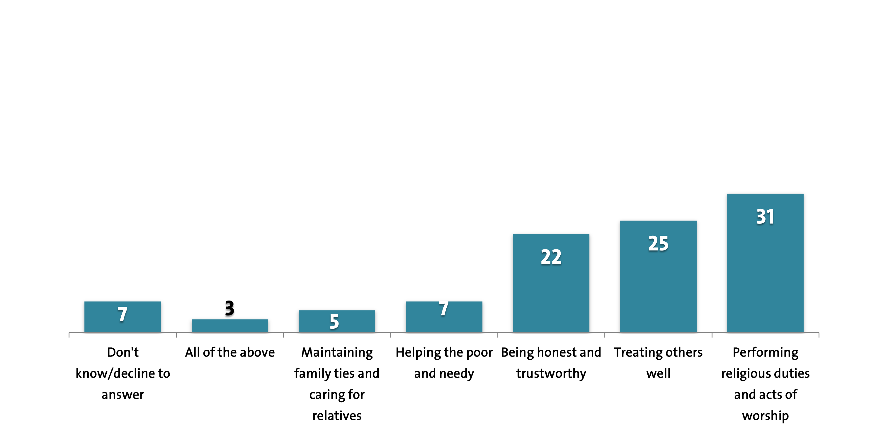 Ten percent of respondents defined themselves as “very religious,” 57 percent said that they were “somewhat religious,” and 21 percent described themselves as “non-religious.” Fifty-nine percent of respondents believed that the most important condition for considering a person religious is positive moral character and behaviour, compared to 31 percent who said that religiosity is linked to performing religious duties and worship (figure 7a). While 15 percent of respondents agreed with the statement that all non-religious people are bad, 75 percent disagreed (figure 7b).