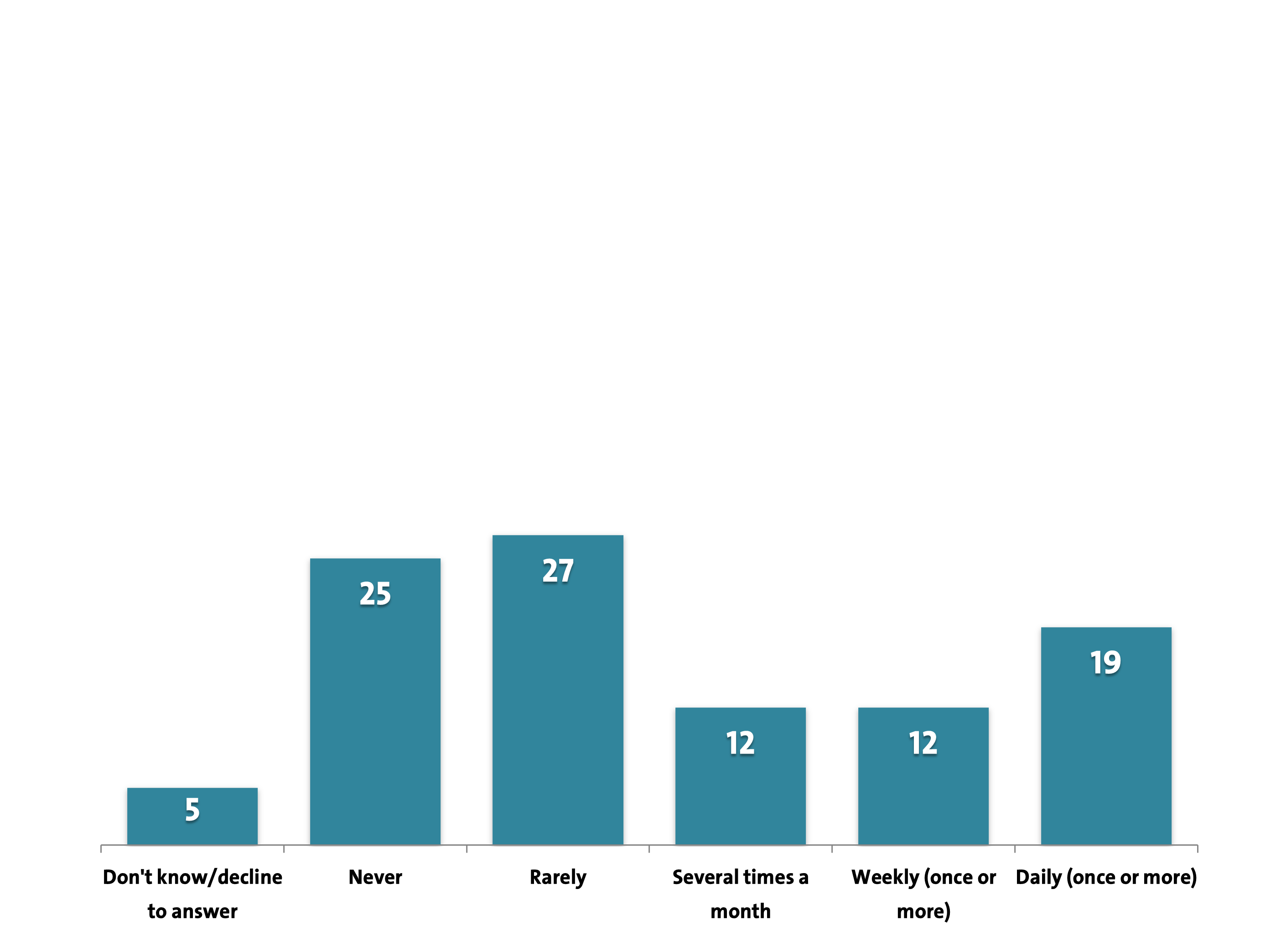 Seventy-eight percent of respondents reported using the internet to varying degrees. Ninety-eight percent of all internet users have a social media account. Seventy percent of users express opinions online about current political events, to varying degrees (figure 8a); 67 percent use the internet to engage with politics.