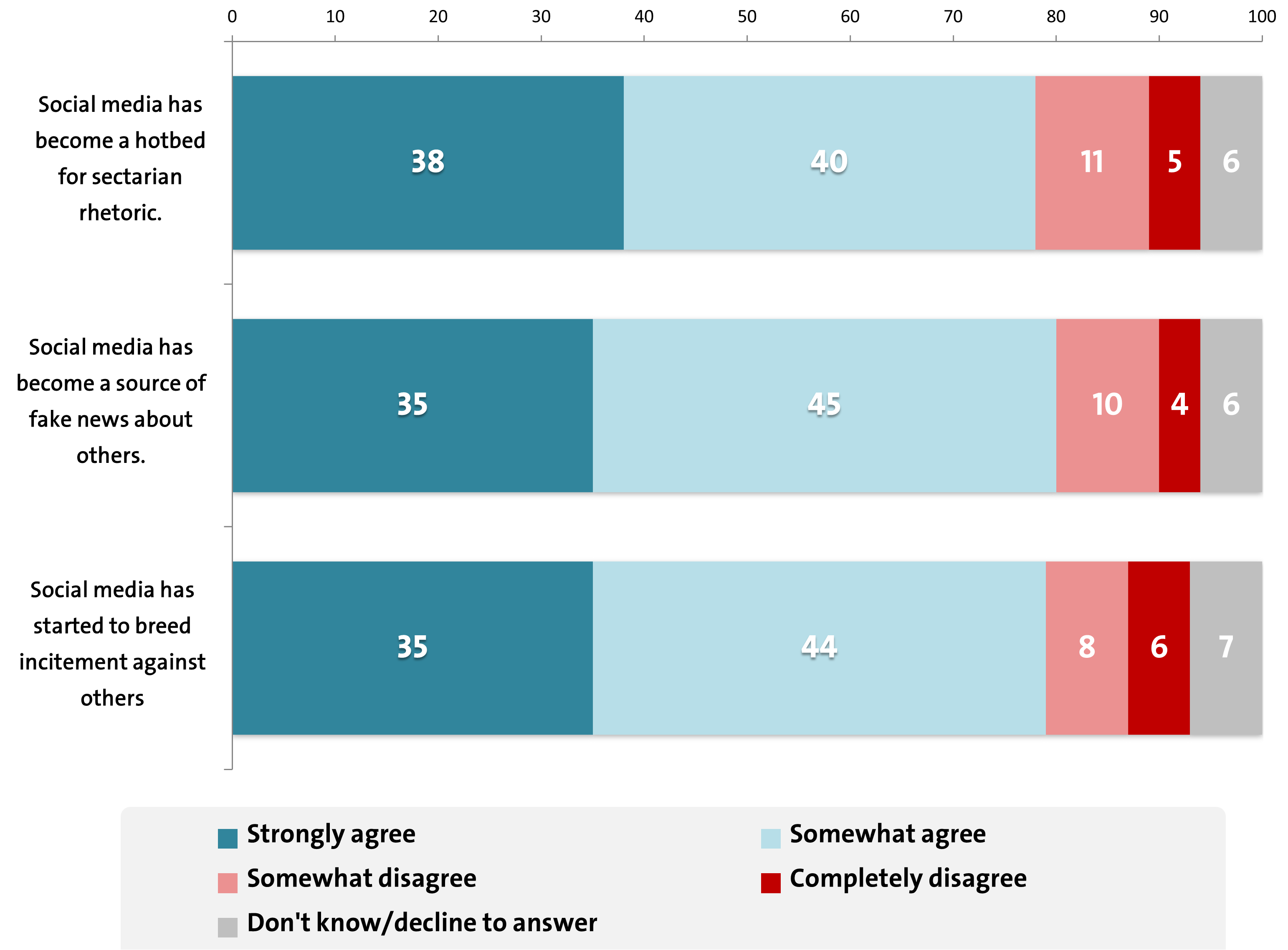 Seventy-eight percent of Syrians agreed, to varying degrees, that social media has become a hotbed for sectarian rhetoric. Eighty percent agreed that it is a source of misinformation about others (figure 8b).