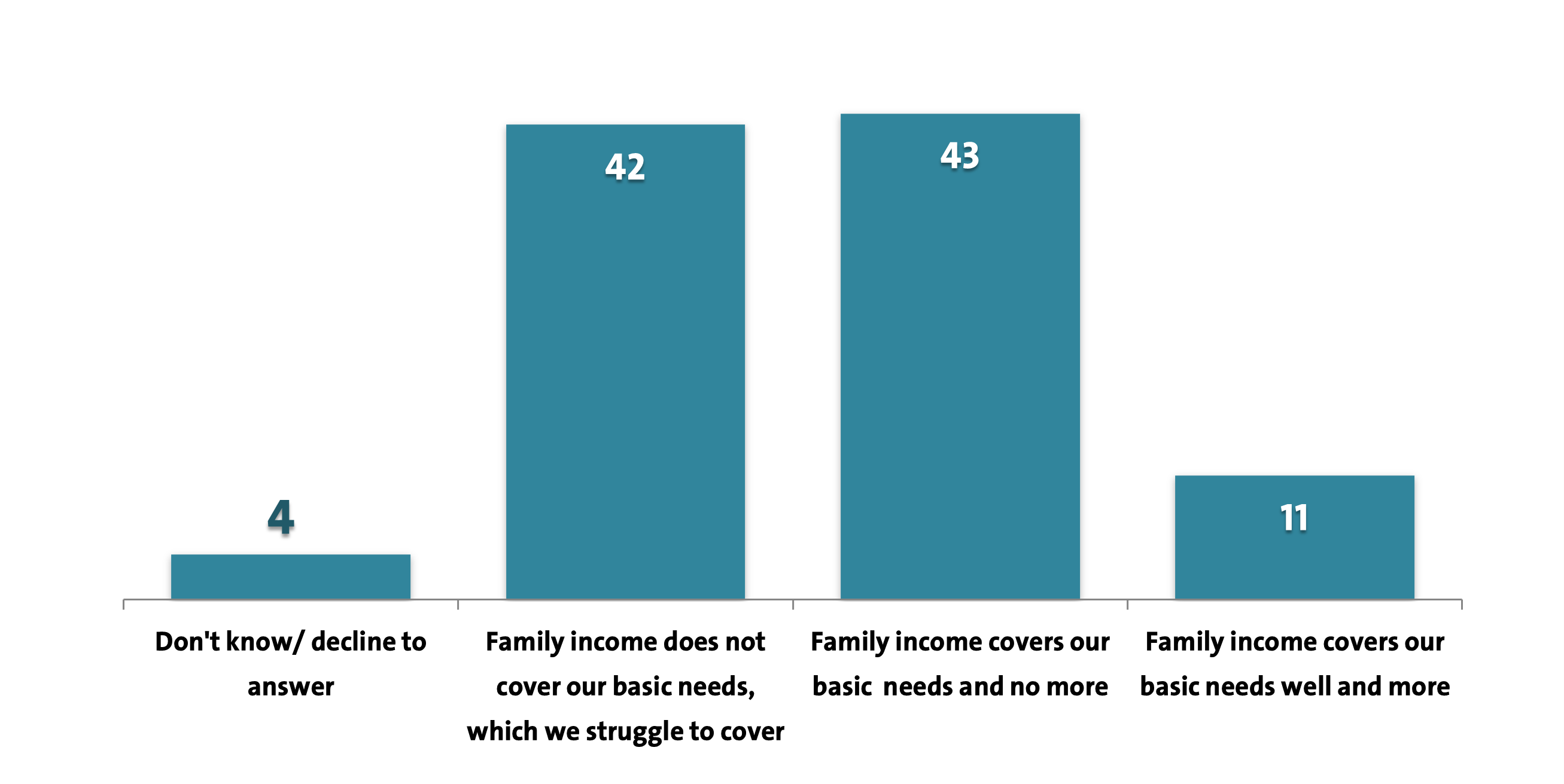 When asked about the economic conditions of their families, 42 percent of respondents reported that their family income was not sufficient to cover their basic needs and 43 percent earned enough to cover their needs, while 11 percent said they earned more than enough to cover their needs (figure 1e). The majority of families in need reported that they depended on assistance from acquaintances to meet their basic needs. Sixty-one percent of the respondents said they ate meat either rarely or less than once a week. Thirty-six percent reported that their families depended on regular or irregular remittances.