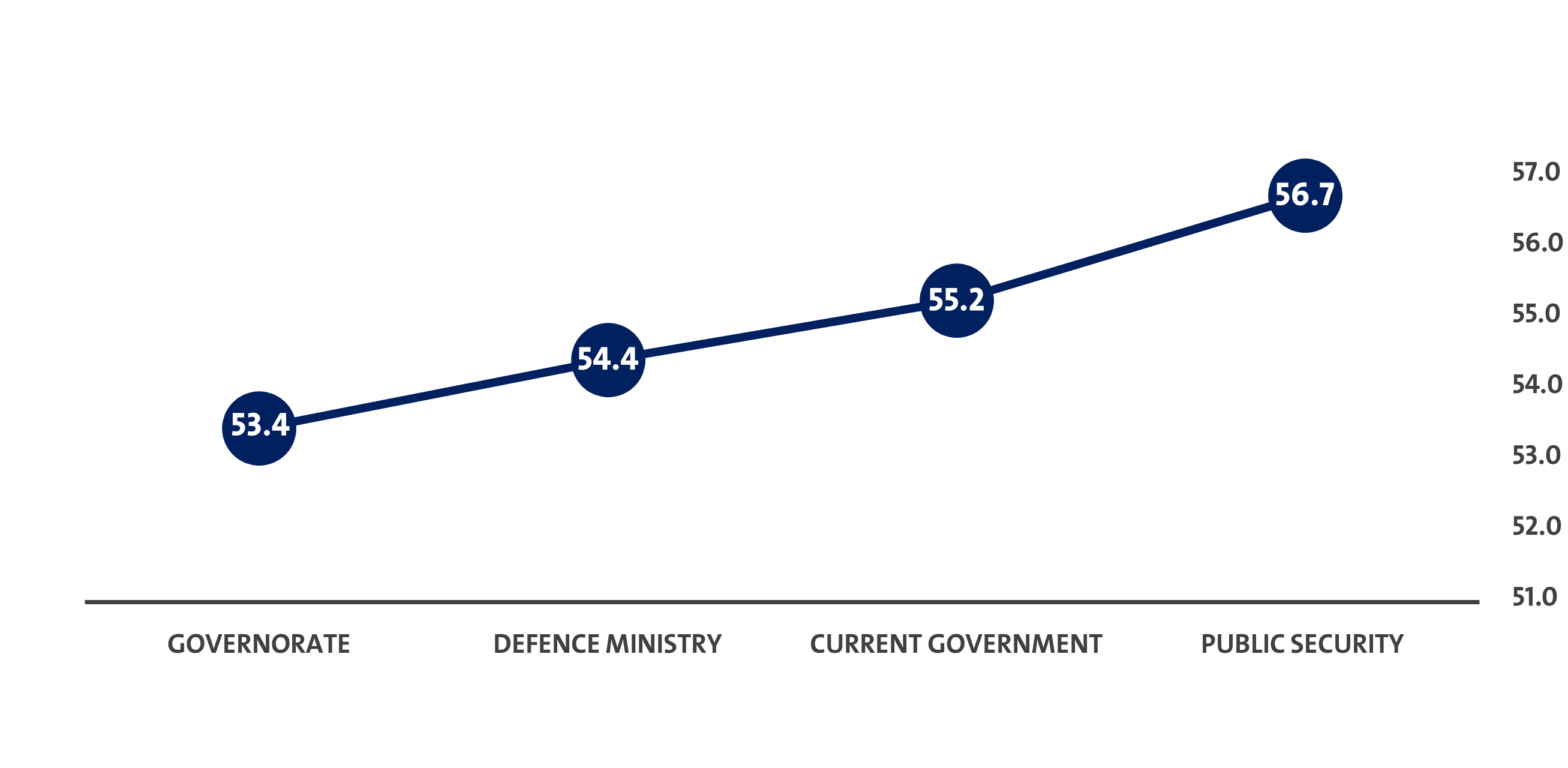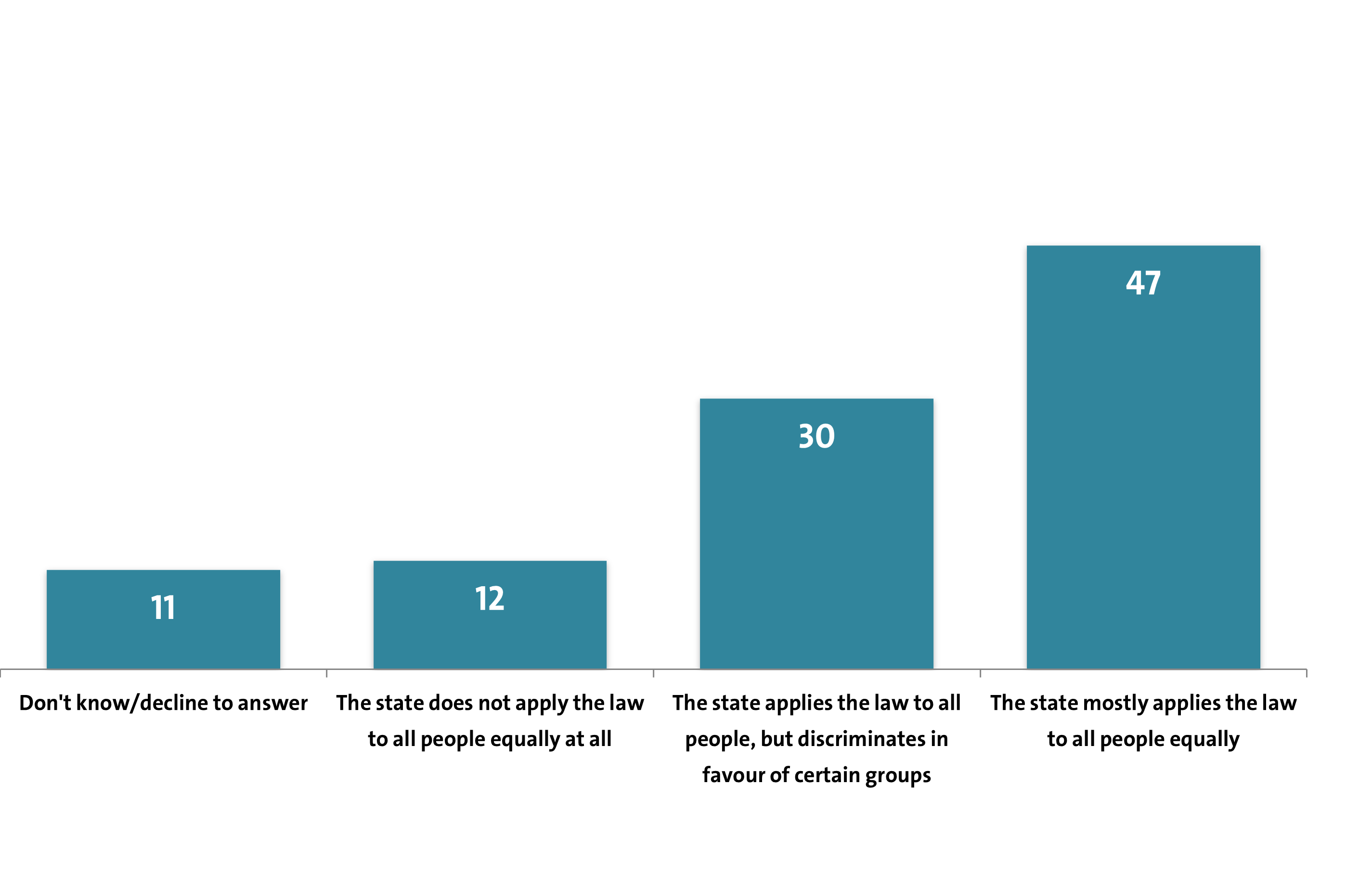 A significant majority—80 percent of respondents—reported an interest in political affairs. 18 percent reported no interest in politics at all. A slight majority reported trusting official institutions, including the security apparatus (56.7 percent), the current government (55.2 percent), the defence ministry (54.4 percent), and the local governorates (53.4 percent) (figure 2a). While 47 percent said that the government applied the law equally among citizens, 30 percent believed that it applied the law but privileged certain groups, and 12 percent said that it did not apply the law equally (figure 2b).
