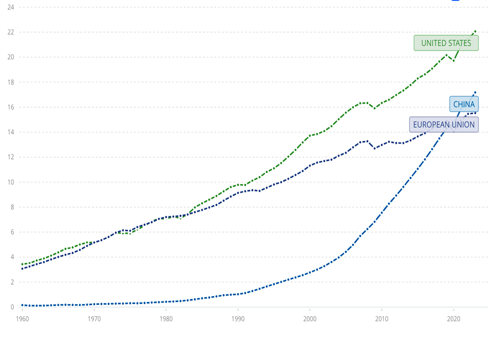 China registered a 5.2% growth rate in 2024. At this pace, China will be able to double its GDP in 13.5 years. A comparison of real GDP between major players shows a decline in the performance of the European Union, but a rapid convergence between China and the US.