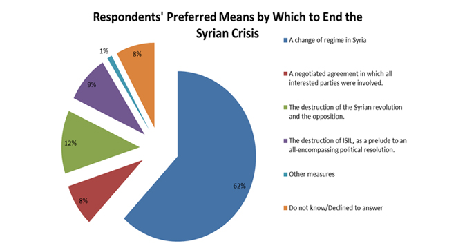 In line with previous polls within the Arab Opinion Index, this year’s results show that a majority (62%) of the Arab public views a change in the Syrian regime as the ideal means by which to end the Syrian crisis. In other words, and comparing these findings to previous opinion polls, the Arab public at large remains sympathetic to the aims and objectives of the Syrian revolution.