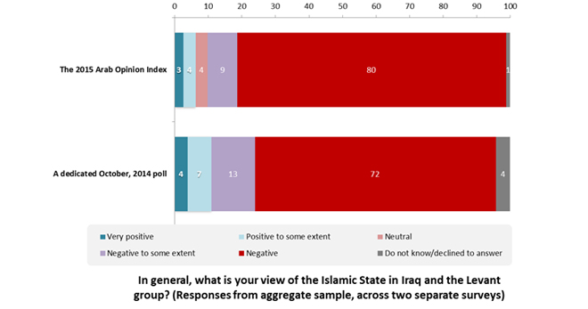 Responses to the 2015 questions show that the Arab world as a whole is overwhelmingly opposed to ISIL, with 89% of respondents offering that they have negative views of the group, compared to only 7% of Arabs who view the extremist organization positively. Equally, the results of the survey show no significant correlation between support for ISIL and religiosity: favorable views of ISIL are equally prevalent among respondents who are “very religious” and those who are “not religious”, and also equally prevalent amongst opponents and supporters of the separation of religion from the state. In other words, support for radical extremist organizations in the Arab world, where it exists, is rooted in political grievances within the Arab region and its conflicts, and not a religious ideology.